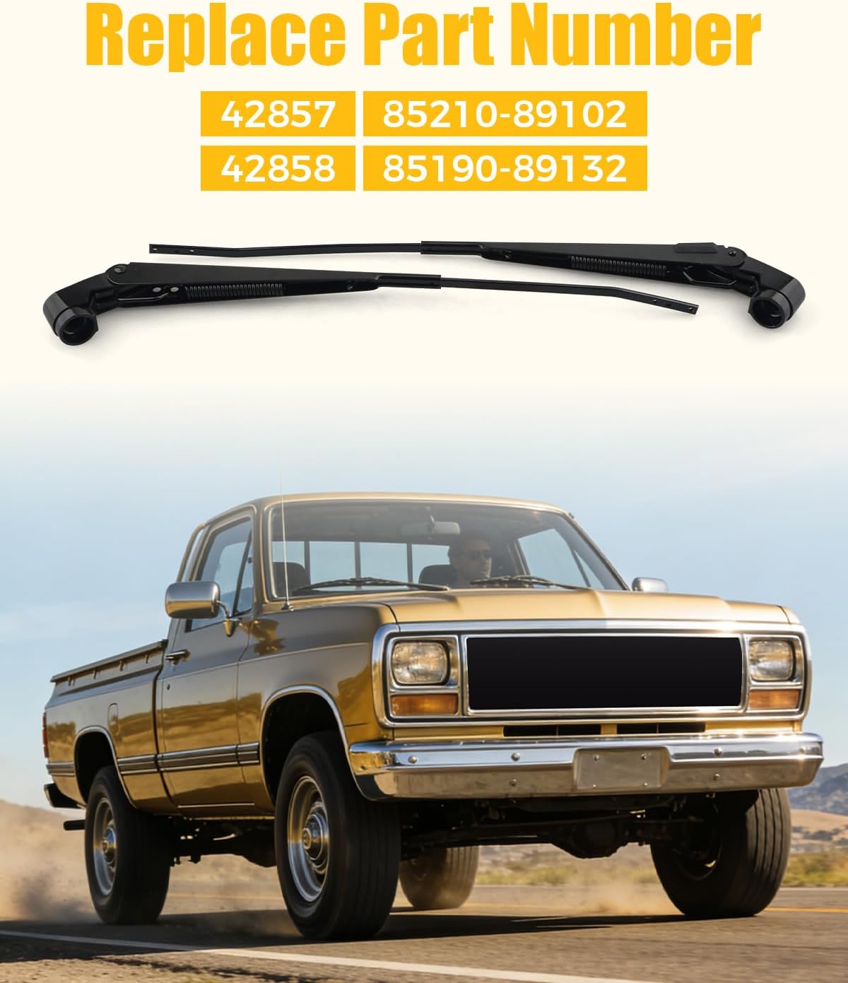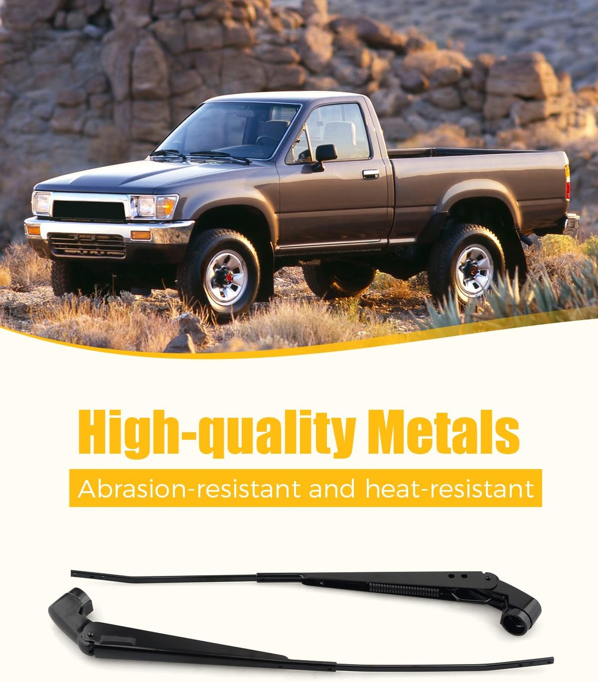 Product Name: 1 Pair Front Windshield Wiper Arm Replacement Kit Compatible Models: Fit for Toyota 4Runner 1984 1985 1986 1987 1988Fit for Toyota Pickup 1984 1985 1986 1987 1988Replace Part Number: Front windshield wiper arm replace part number 42857 85210-89102 42858 85190-89132 Function: The windshield wiper arm can efficiently remove rain, snow and debris from the glass, ensuring a tight contact between the wiper blade and the glass without any streaks or missed areasMaterial: This wiper arm features a high-strength metal frame and an enhanced anti-rust coating, which can maintain its shape and flexibility for a long time, effectively reduce swinging vibration, and produce lower noisePackage includes: 1* Left driver side windshield wiper arm1* Right passenger side windshield wiper arm (As shown in the first picture)Note:Please check the part number and compatibility to make sure you are buying the correct itemCustomer Service: Please make sure the part is the correct part you need before purchasing. If you have any questions, please contact us and we will respond to you within 24 hours