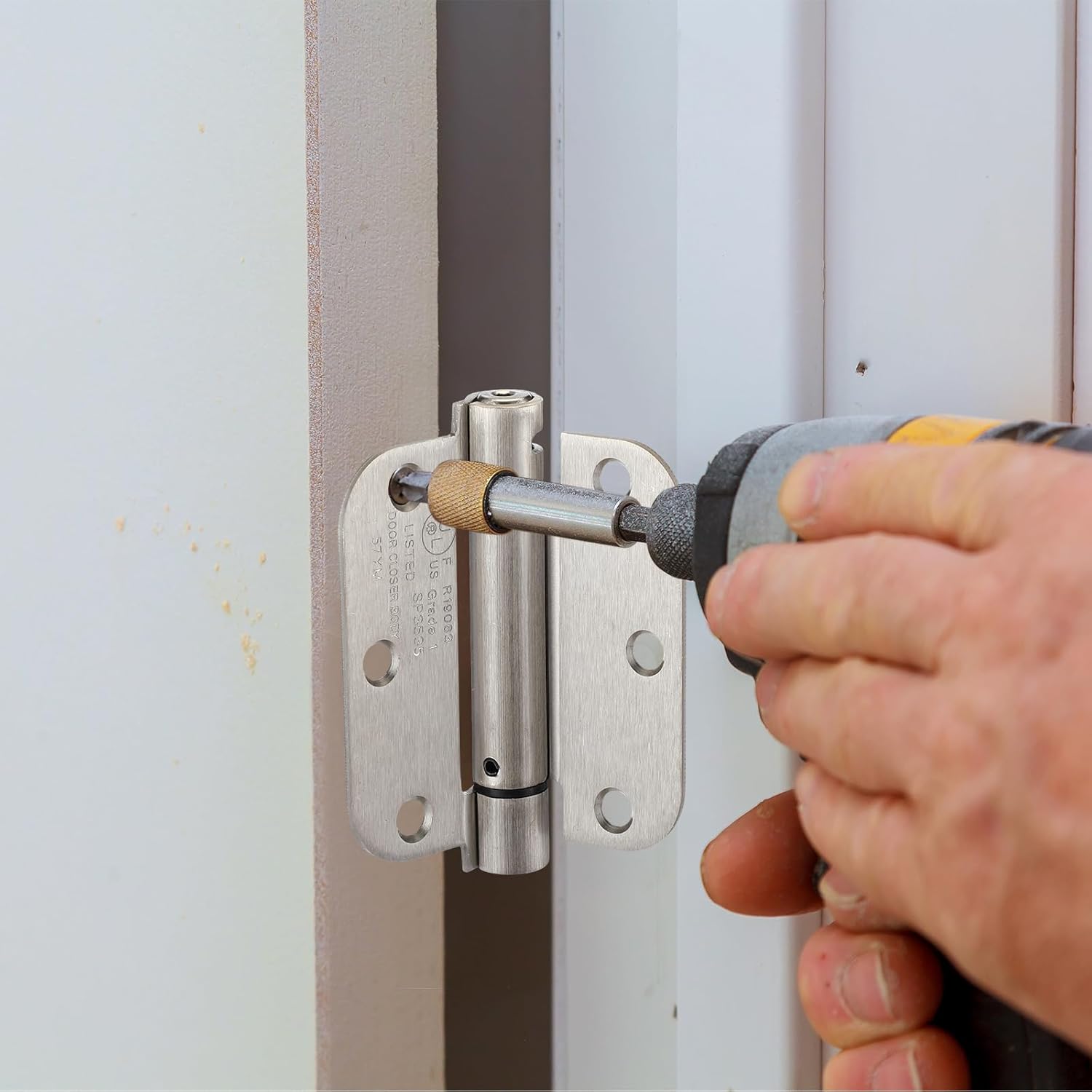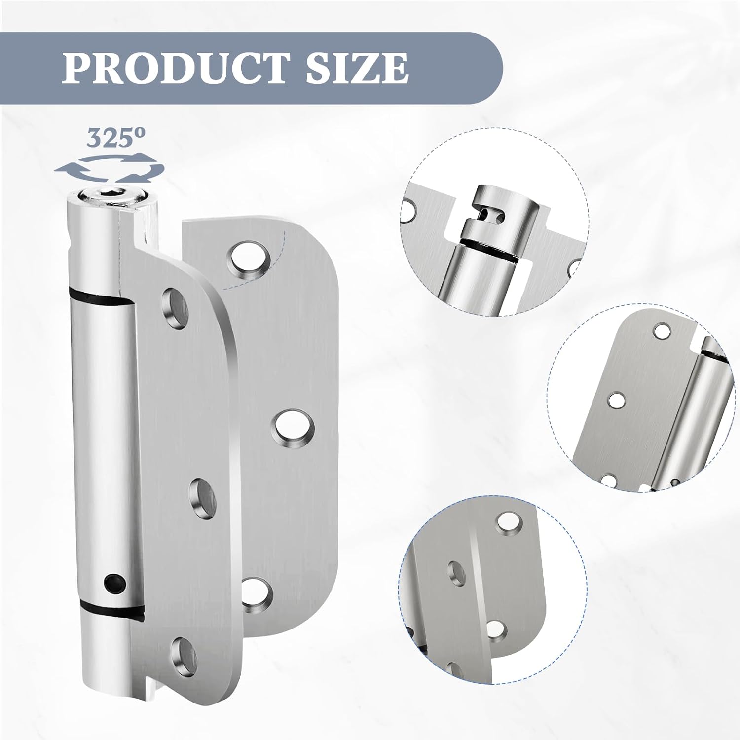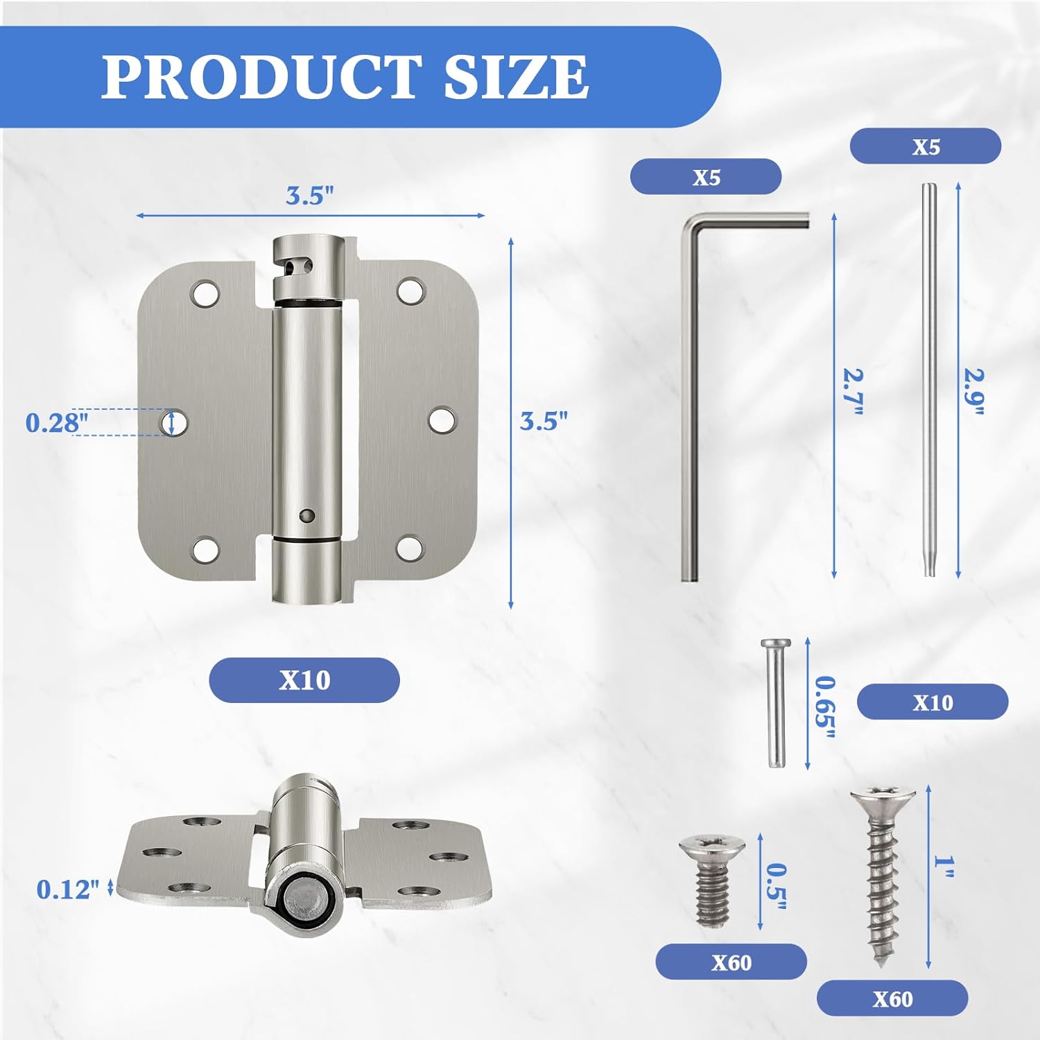 Features: Safety recommendation: For maximum security and smooth operation, we advise you to install at least 3 door hinges per door. This recommendation ensures your door's stability and improves its weight support. Dynamic auto closing feature: The exterior door hinges feature an ideal auto closing mechanism with a resilient closing force for doors left ajar. The adjustable tension allows you to regulate the closing force, providing you a nice using experience. Specifications: Material: iron with an electroplated coatingColor: silverSize: about 3-1/2 inches in length and width, with corner radius about 5/8", and thickness about 0.11 inches/ 2.7 mmPackage includes: 10 x Door hinges5 x Hex wrenches5 x internal angle screwdrivers20 x Positioning rods60 x Flat head screws60 x Pointed screws Notes: Manual measurement, please allow slight errors on size. The color may exist a slight difference due to different screen displays.