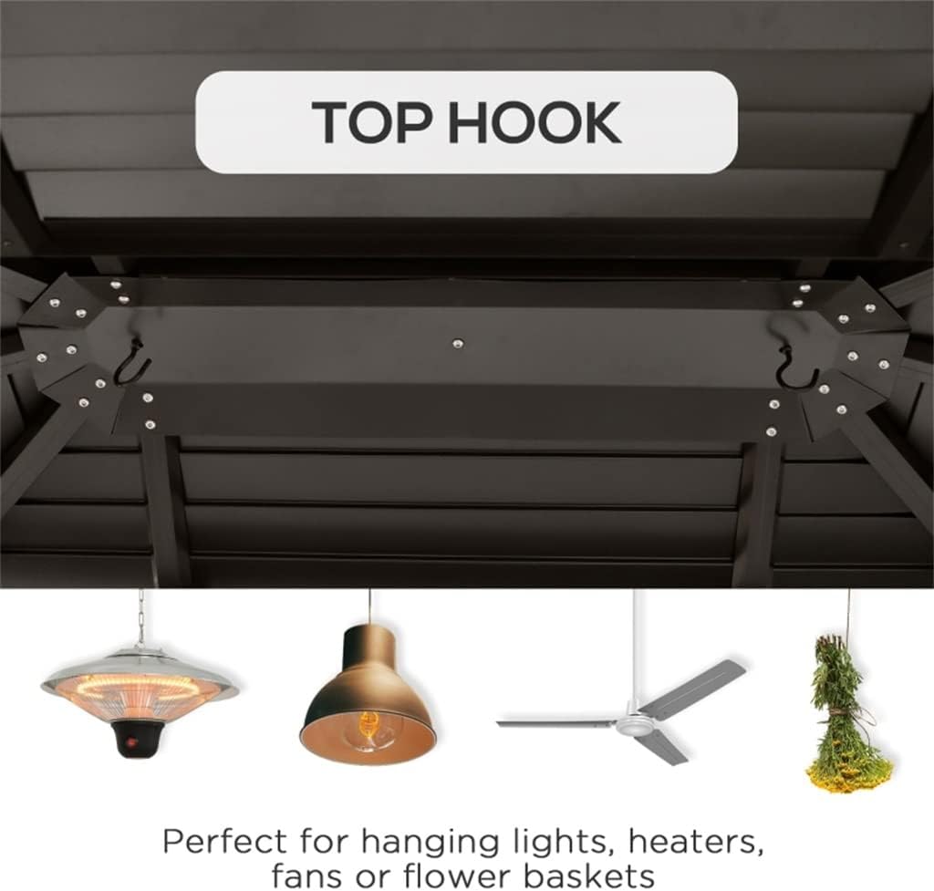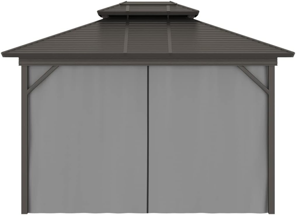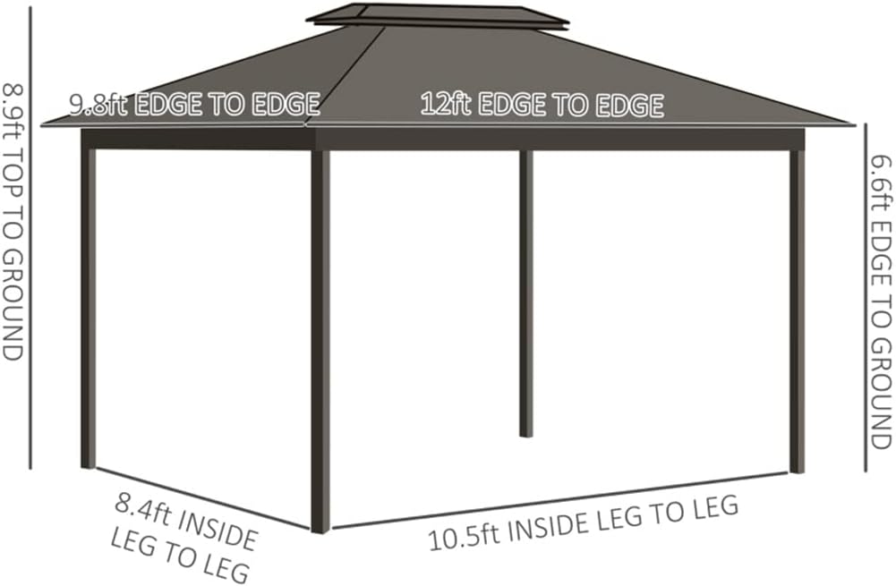 Features:- Versatile and elegant design, for garden, backyard, patio, and other outdoor space- Built with an aluminum supporting frame with sturdy galvanized steel hardtop- Double-tiered roof with mesh netting adds protection from sun, rain, and wind- Offers ample room for parties without feeling crowded- Fully enclosed zipper netting and curtains keep pesky elements away and adds privacy- Top hanging hooks allow you to hang a lantern or patio heater from the inside roof area- Includes 12 ground stakes and 12 expansion screws for soft or hard floor anchoring- Assembly is requiredSpecification:- Color: Dark Grey- Material: Aluminum, Galvanized Steel, Polyester Fabric- Overall Dimensions: 12' L x 9.8' W x 8.9' H- Inner Space: 10.5' L x 8.4' W- Eave Height: 6.4'- Windproof level: 7 (31.5-38.5 mph)- Snow Load Capacity: 220 lbs.Pieces Included:1 x Patio Gazebo12 x Ground stakes12 x Anchor Bolts1 x ManualNote:Due to different monitors and lighting effects, the actual colour of the product may differ slightly from the colour shown in the pictures. Thank you!Please allow 1-2 cm deviation due to manual measurement.The side wall of the net blocks unwanted guests with wings, and the side curtains can prevent wet environment.