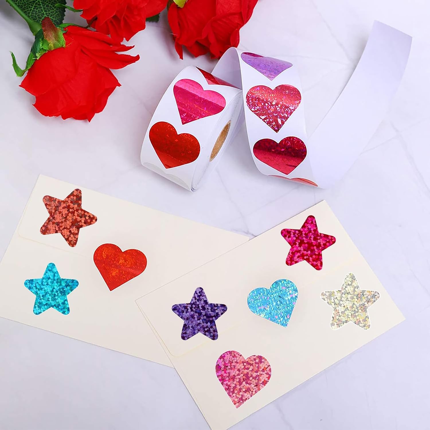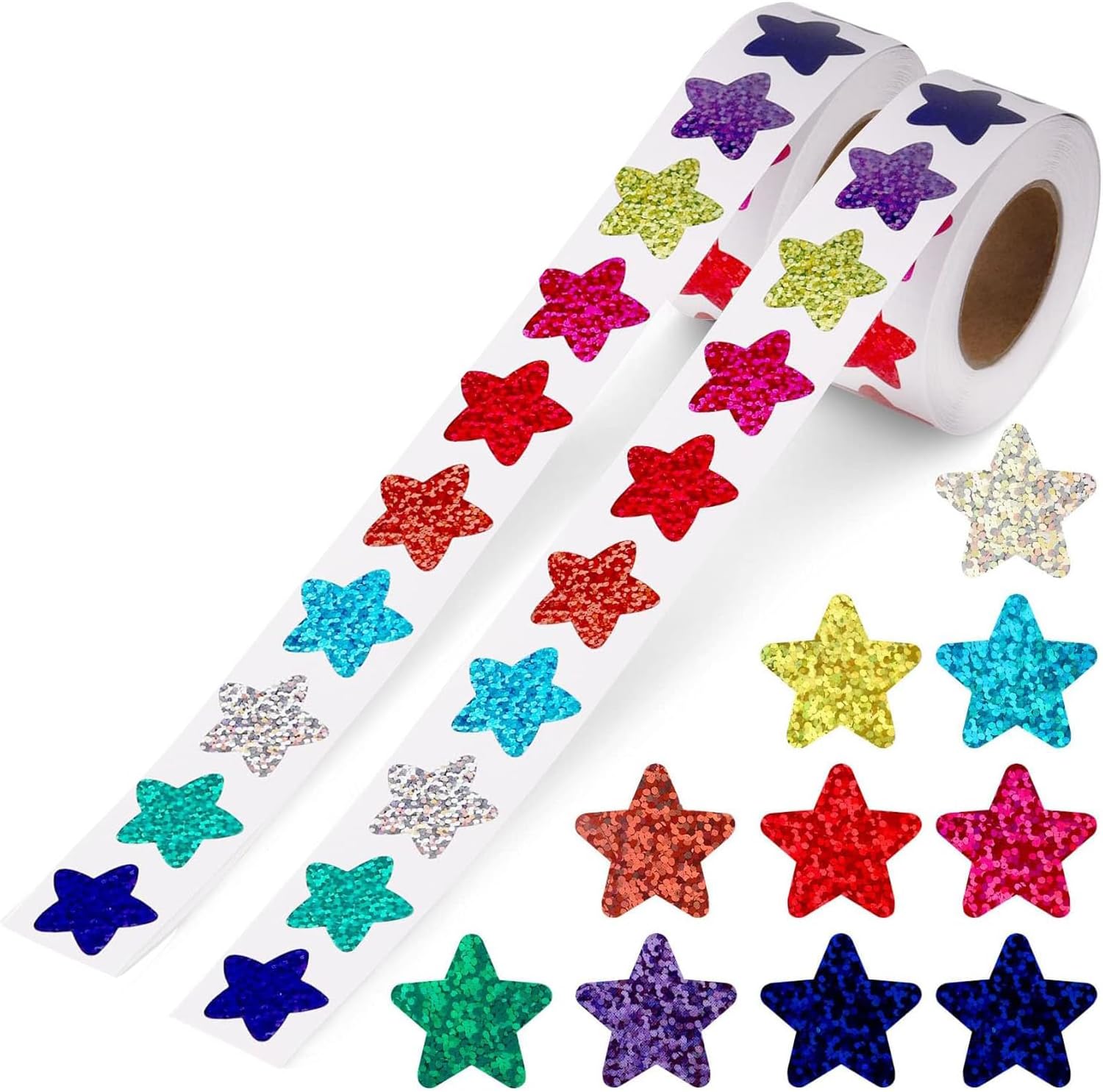 500pcs Glitter Star Stickers and 500pcs Colorful Heart Stickers, 1 Inch Self-Adhesive Reward Stickers for School Teacher Classroom Envelope Birthday Party Decoration Parents DIY Crafts1000 PCS Incentive Stickers (1 roll 500pcs Glitter Star Stickers1 roll 500pcs Colorful heart stickers)About Incentive Stickersโค๏ธ You will receive 500pcs star stickers in 8 colors and 500pcs heart stickers in 8 beautiful colors. Each glitter sticker size is about 1inch/2.5cm. There are enough stickers for your daily use needs.โญ Glitter stickers are made of quality laser paper, Safe tough and have no pungent smell, not easy to break, deform, reliable and sturdy, which is the perfect choice for your favorite DIY crafts.๐ Peel and stick with ease. These star and heart stickers are easy to peel and cut finely. They can be firmly stuck on any surfaces and are easy to remove without leaving traces.๐งก These beautiful love heart and star stickers are self adhesive, suitable as rewards or gifts for students. They will be very happy and encouraged.๐ Vibrant colors and glitter star and heart stickers can be widely used for our daily life. Use them to decorate walls, notebooks, gift boxes, envelopes, cards, bottles, bags, and other items. And perfect for birthday parties, weddings, Valentine's Day, and Christmas decorations.Specification:Color: multicoloredMaterial: Laser paperInstallation Type: Self-AdhesiveProduct Size: 2.5cm / 1inch in diameterPackage Listing500 x Glitter star stickers500 x Colorful heart stickersNote:Due to manual measurement, the size and weight may have a certain error.Due to the difference between different monitors, there may be a slight color difference existed.