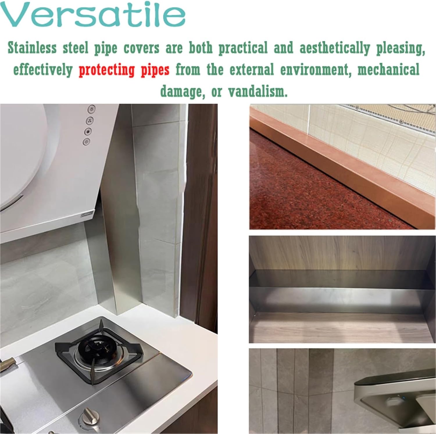 Upgrade your piping setup with our stainless steel pipe cover, a sleek and efficient solution for clean and safe concealment both indoors and outdoors. This cover is expertly designed to shield pipes from dust, rain, and debris, making it an ideal choice for various applications. Whether you need an outdoor windproof ventilation duct guard or a weatherproof wall duct closure concealer, this product fits the bill perfectly.Specifications- Material: Stainless Steel- Available Sizes (Width × Length):- Width: 5cm-20cm / 2in-7.9in- Length: 30cm-150cm / 1ft-4.9ftFeatures- Provides comprehensive protection against dust, rain, and debris, ensuring your pipes remain in top condition.- Ideal for use as an outdoor windproof ventilation duct guard or cover, enhancing durability in harsh weather.- Compatible with various pipe diameters, suitable for both residential and commercial applications.- Functions as a stylish indoor windproof pipe covering, seamlessly blending into modern interiors.- Customizable lengths are available to accommodate different pipe runs, whether short or long.- Easy installation—simply align, place, and secure without the need for tools.- Offers a clean-lined alternative to traditional wood pattern duct concealer options. - Ensures seamless integration into any interior or exterior design scheme.- Perfect for modern settings, acting as an indoor hidden duct concealer that enhances aesthetic appeal.- The smooth stainless steel finish adds a touch of sophistication to any space.Package Includes: - 1 × Stainless Steel Pipe CoverPlease Note:- Measure your pipe system carefully before purchase to ensure the best fit. - Surface finish may vary slightly under different lighting or screen conditions.Transform your space with our stainless steel pipe cover, where functionality meets style.