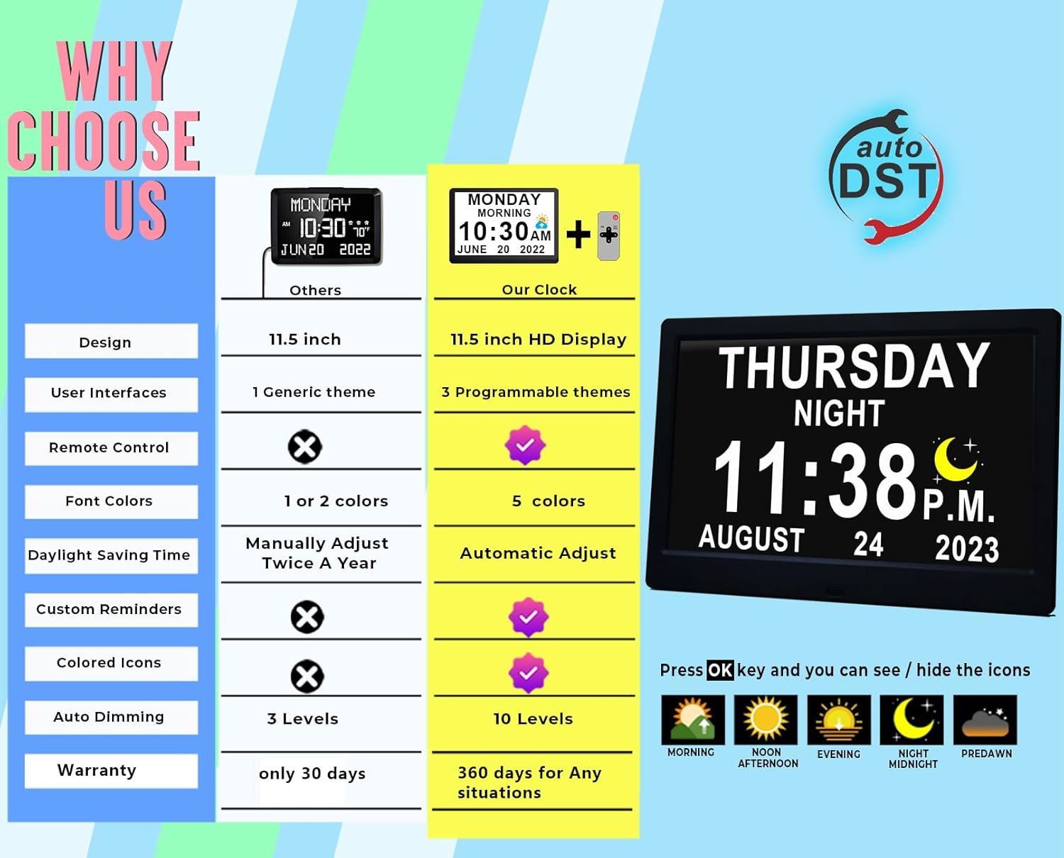 | Additional Features | 10-level adjustable night dim, Auto DST adjustment, Custom 20 daily weekly or specific date reminders, Talking Time and Date (English), power cord and remote control included |