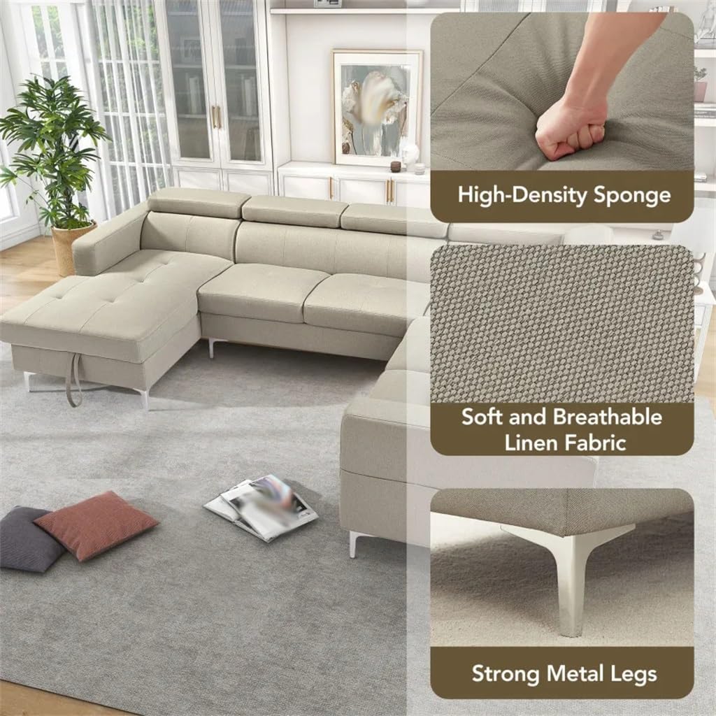 120'* 94.5" 3-Piece Sectional Sofa U Shape with Storage Left Chaise Lounge with Adjustment Linen Fabric