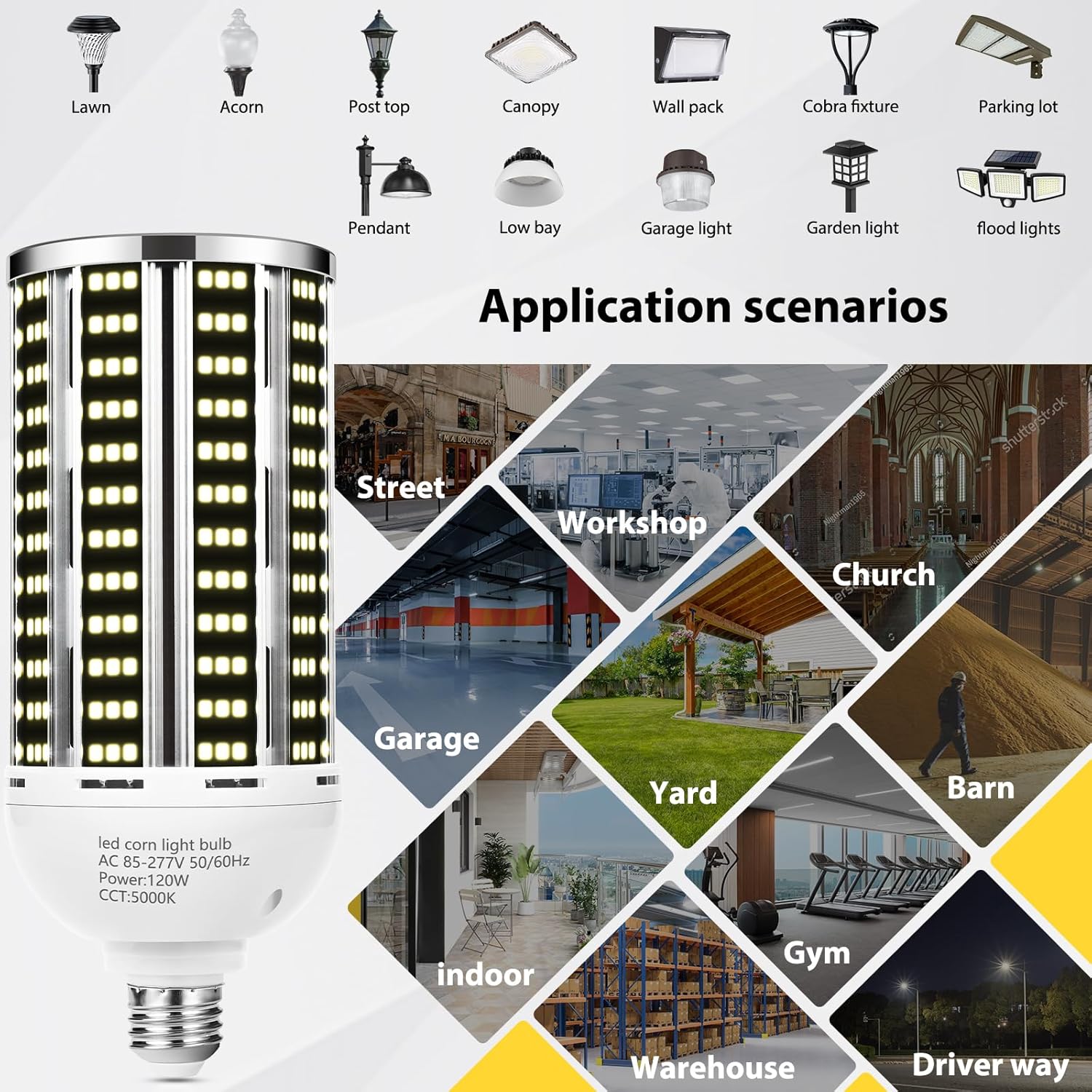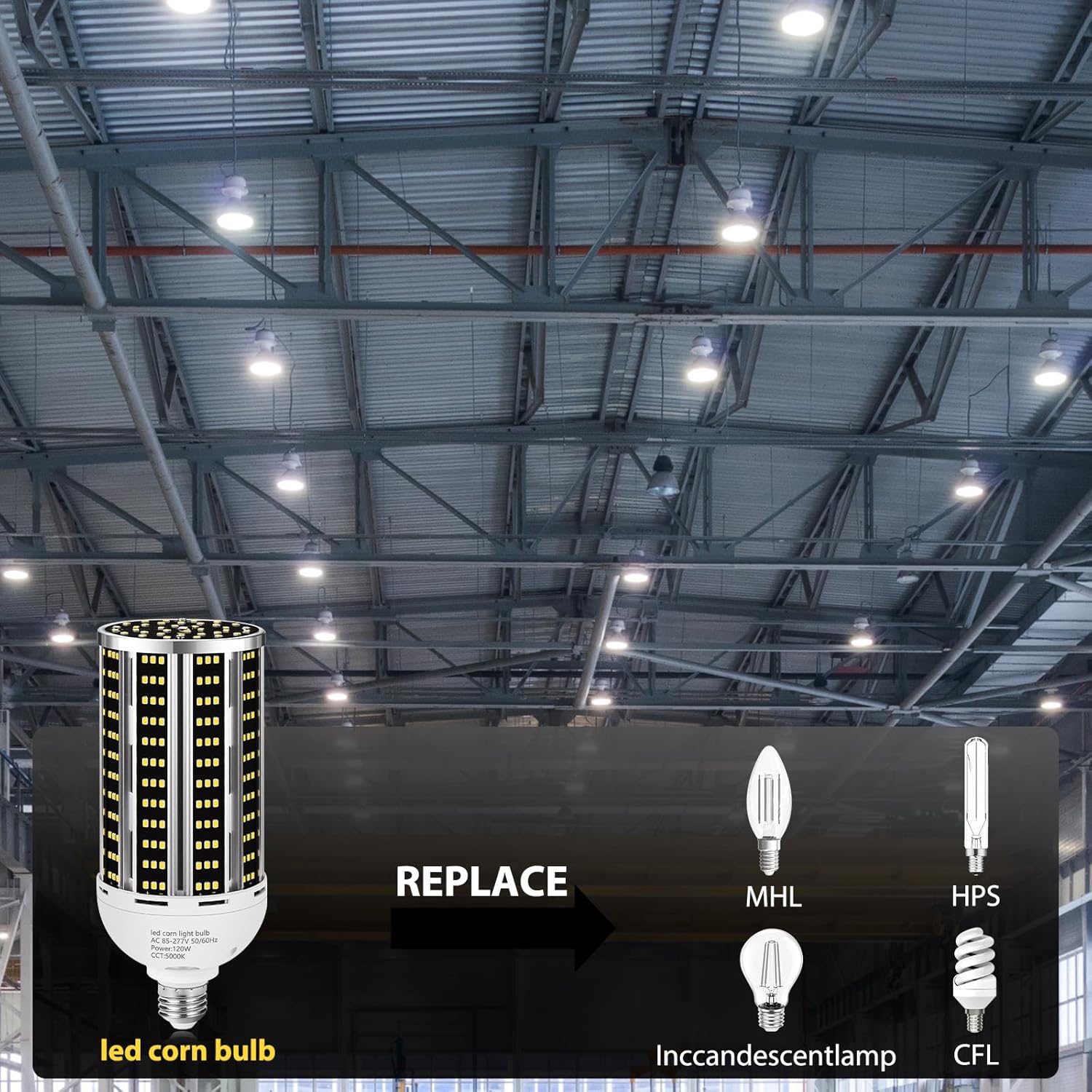 YANYCN Led Corn Light Bulb:1. High quality LED chips,heat control system and cooling structure design, lead to longer usage lifespan: Over 55,000 hours;2. 85+ CRI(Color Rendering Index) make colors appear as they really are. See all color the way they are supposed to be seen3. 85-277v US Stantard Power,Overheating of LED driver is the main cause lead to light failure. our strong isolated LED driver ensure the stability and long lifespan4. Strong aluminum heat sink protected. 360° beam angle lighting more bright,Fanless design, fast heating dissipation. No worries for application within both wild open or totally enclosed luminaries5. High quality LED chip create a stunning 15900 lumens brightness output,bright as a small sunApplications Scenes:Fit both US regular and large mogul screw-in base fixtures,widely used at home,garage,basement,storehouse,driveway,supermarket,office,gas station,warehouse,barn,yard,supermarket,facotry,parking lots,school,hospital,street light,showroom,gym wherever needs sufficient lightingSpecifications(single):* Luminous power: 120W;* Color: 5000K/DayLight;* Input Voltage: AC 85v-277v / 50-60Hz;* Lumen Efficacy: 150LM/W* Socket: E26/E39* Beam Angle: 360 degrees;* Material: Aluminum + PC;* Working environment:-4~+113℉;Attention:Switch off the power before replacing the bulbBypass the ballast for MHL/HID/HPS replacementThis bulb is non waterproofThis bulb is non-dimmableDo not stare at the light when it is workingPACKAGE :-2PCS x 120W LED Corn Light BulbThank you