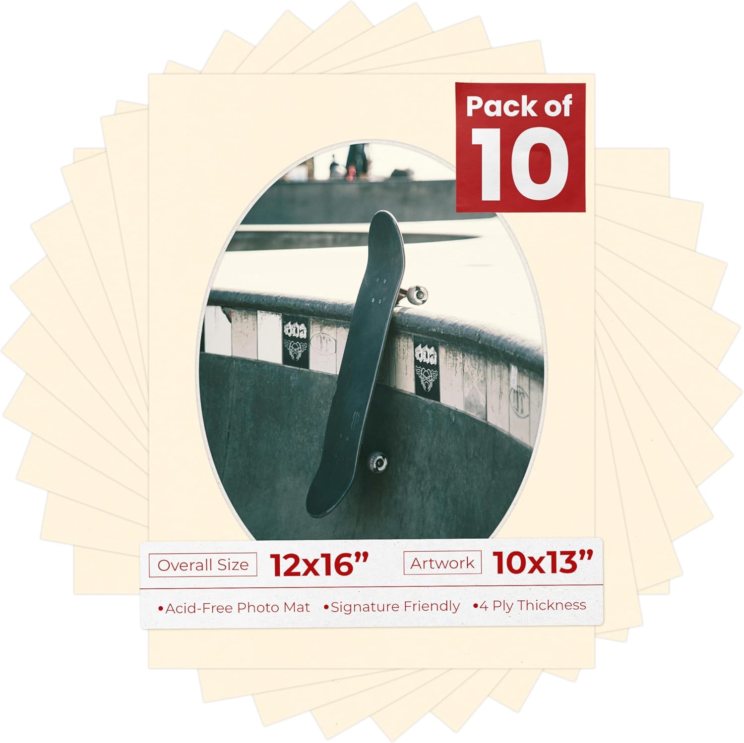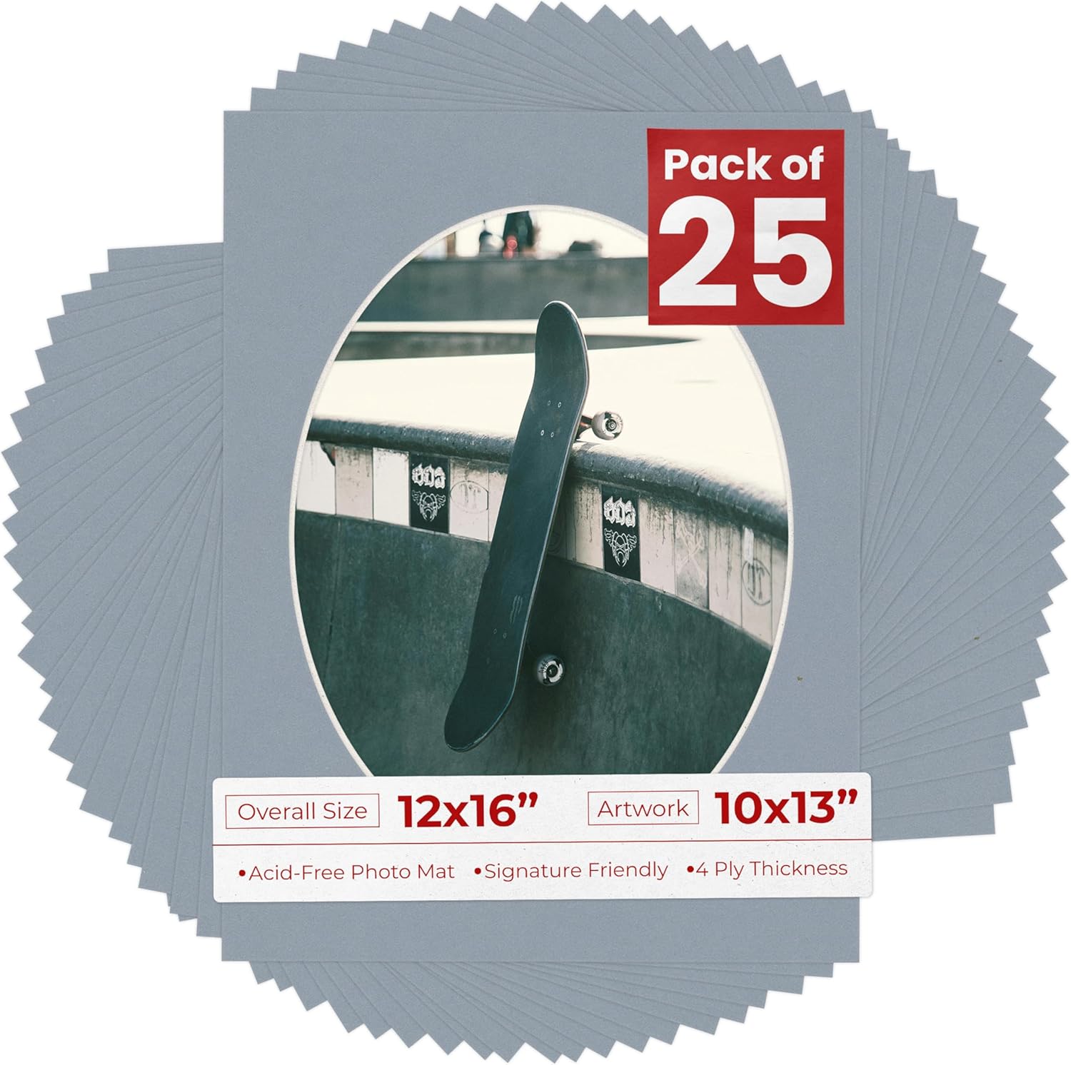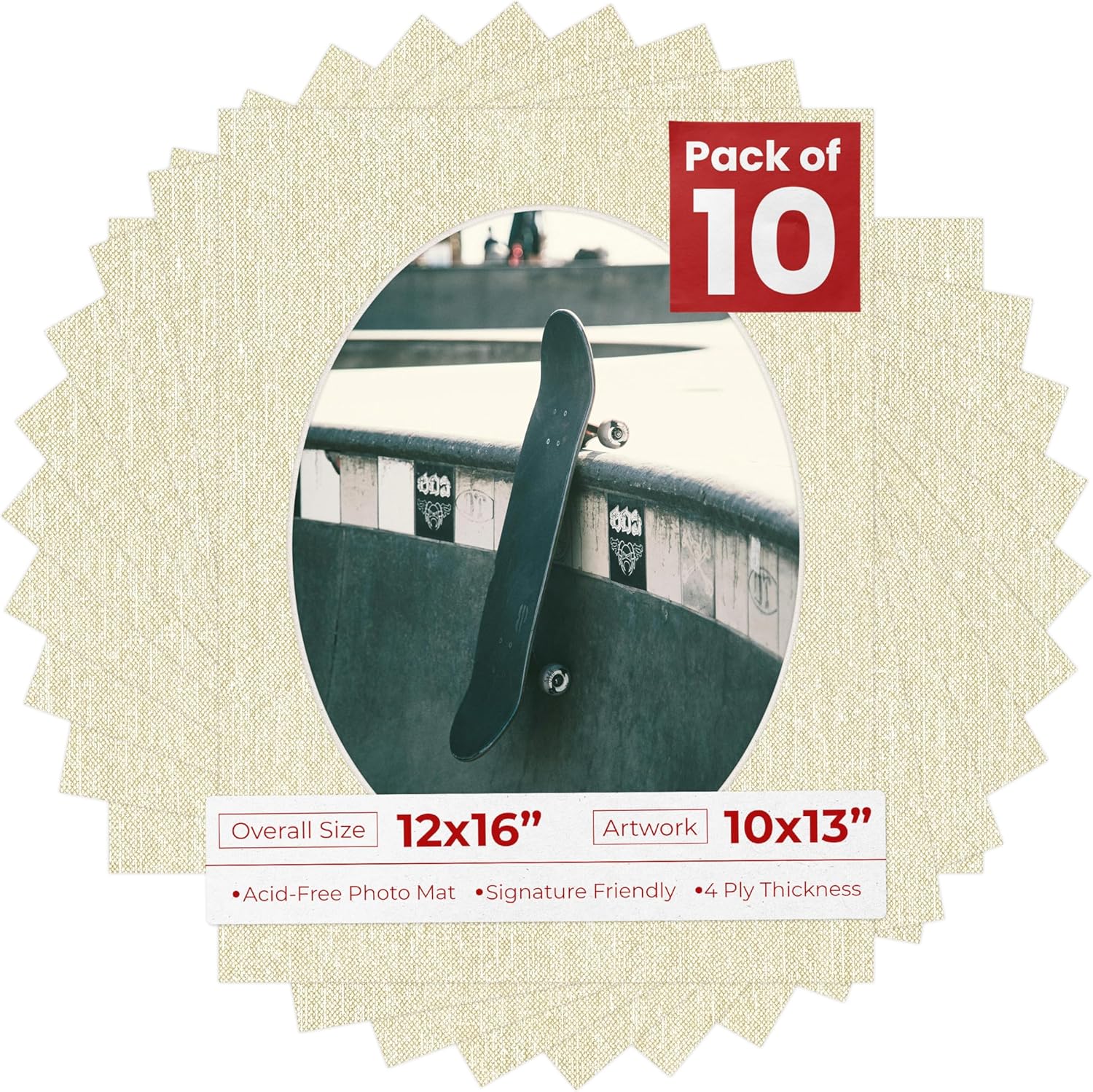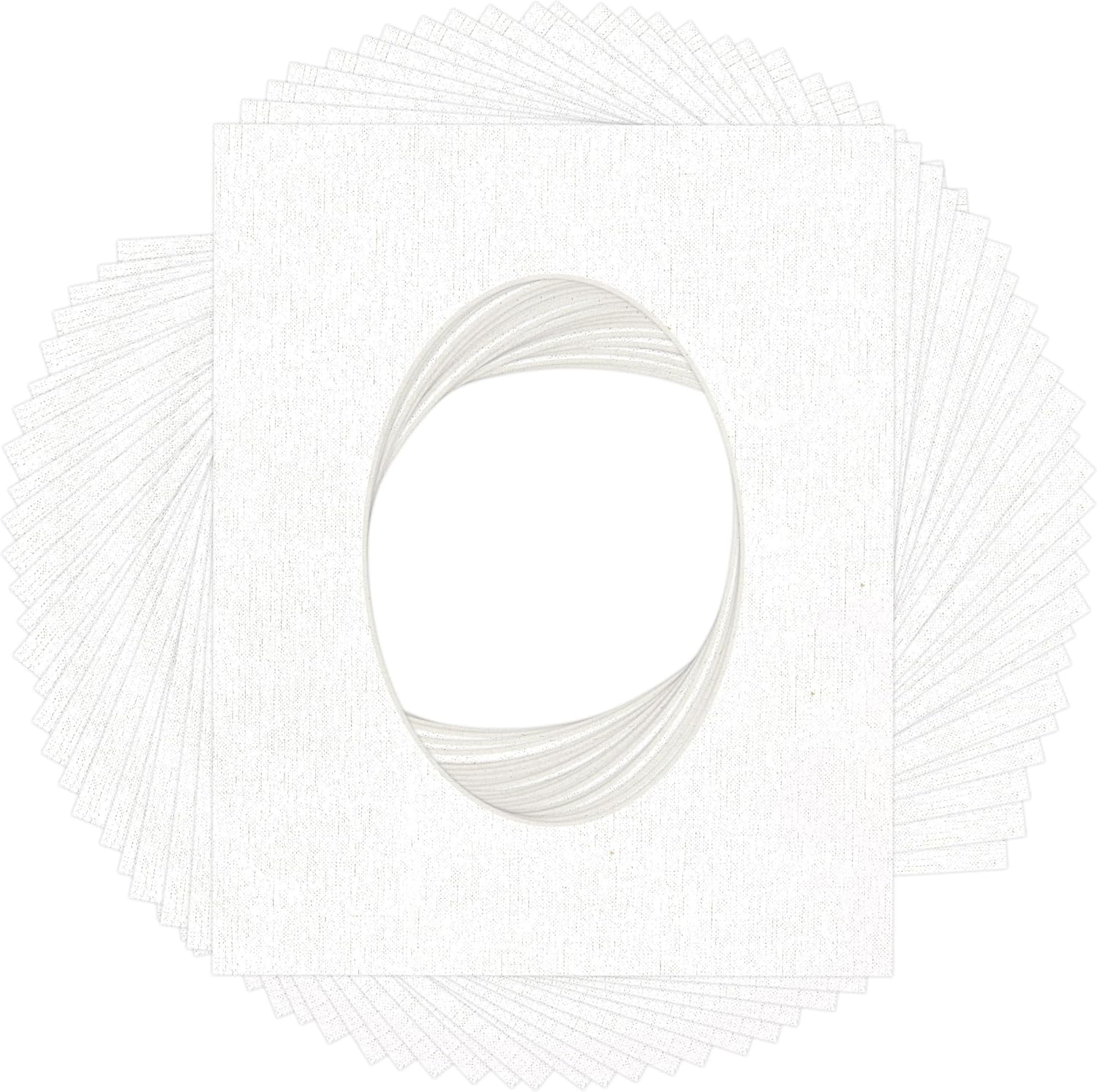 OVERALL SIZE (Made to fit a Frame Size Measuring) 12x16 Inches | Bevel Cut Oval Opening Size of 9.5x12.5 inches | For a Photo Measuring 10x13 Inches. THIS IS FOR 25 matboards show kits with acid free backings & clear bags. White linen canvas PHOTO MAT with a oval bevel cut opening. A great way to change up the look of an existing frame with a new accent mat board. This matte also works great as a replacement for damaged, dirty, or faded matting in your old frames. PREMIUM QUALITY: Our precut photo matboards are acid free & precision cut with a 45 degree bevel by machine for perfect corners and NO over-cuts every single time. All of our precut matboards are MANUFACTURED BY POSTER PALOOZA IN THE USA.