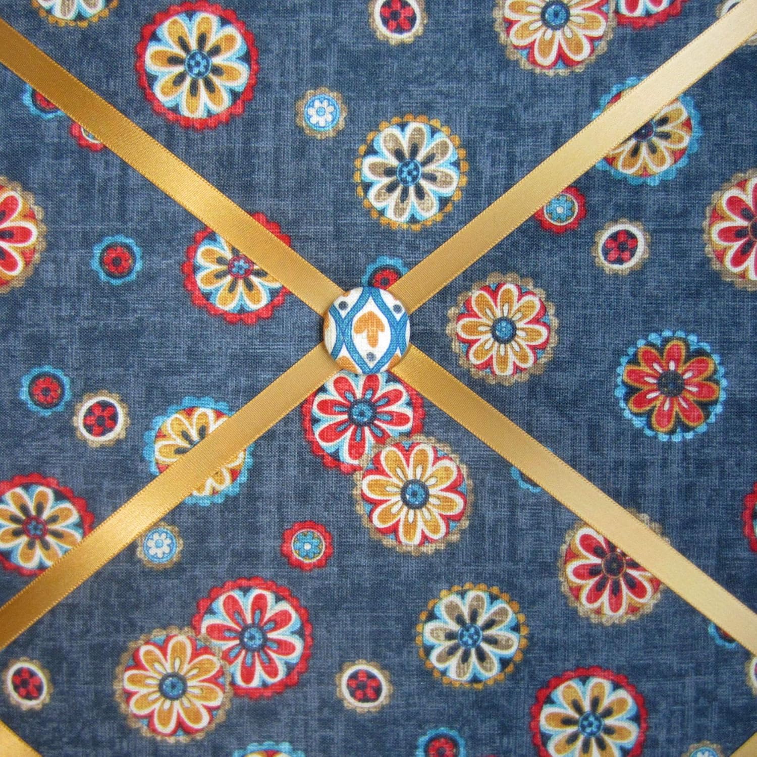 This 16"x20" memory board is so pretty in a navy fabric with floral medallions. The fabric is a beautiful blend of red, orange, gold, and yellow. The fabric is accented with a gold satin ribbon and buttons with a coordinating fabric. Handmade fabric memory boards are designed to be used without tacks or push pins. Great for: *Organizing photographs (your own or all those Christmas photo cards!) *Organizing business cards *Hanging hair accessories or jewelry *Safely storing your household bills *Organizing the million slips of paper covering your desk! This memory board is made with designer fabrics and top quality materials. The back is finished with a felt back and ribbon. Each memory board has a saw tooth hanger on the vertical and horizontal sides. Due to the many variations in monitors and browsers, color samples may appear different on different monitors. Computer monitors are not all calibrated equally and color reproduction on the Internet is not precise. Since it is not possible to guarantee our online colors will look the same on all computers, we do not guarantee that what you see accurately portrays the color of the actual product