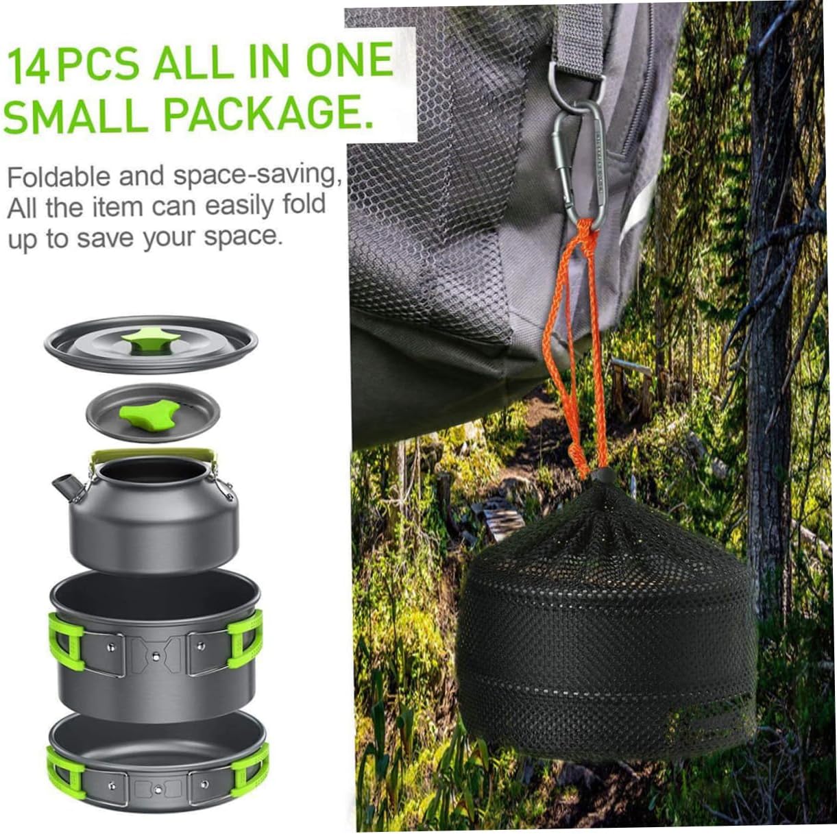 Package List 1 x pot 1 x frying pan 1 x teapot 1 x spoon 1 x fork 1 x table-cutlery 3 x bowls 1 x soup spoon 1 x buckle 1 x brush 1 x wood spoon Characteristics -Material: Aluminium alloy camping cookware. -Color: Assorted Color. camping cooking tool equipment -Size: About 18.00X18.00X12.50cm/7.07X7.07X4.91in. camping cookware set - multi-function tool, suitable for hiking, picnic, camping, backpacker cookware for camping. - Using non-stick camping cooking utensils, you can cook delicious food even in outdoor activities outdoor cooking set. - Including a pot, frying pan, , spoon, fork, table-cutlery, bowls, soup spoon, buckle, brush and wood spoon, this set can meet your essential needs. Camping Cooking Accessories - Lightweight and folding design, easy to store and carry to travel anywhere outdoor cooking kit. - Not easy to shake, convenient, , comfortable, , high hardness, wear-resistant, -resistant Camping Cookware Kit.Goods InformationCamping Cookware Kit Manufactured with for and use.camping cookware for as a to friends who love camping, hiking, etc.outdoor cooking kit This item is a set of outdoor camping cooking tool.Camping Cooking Accessories This camping cooking set has been carefully designed to make your camping experience more fun and convenient