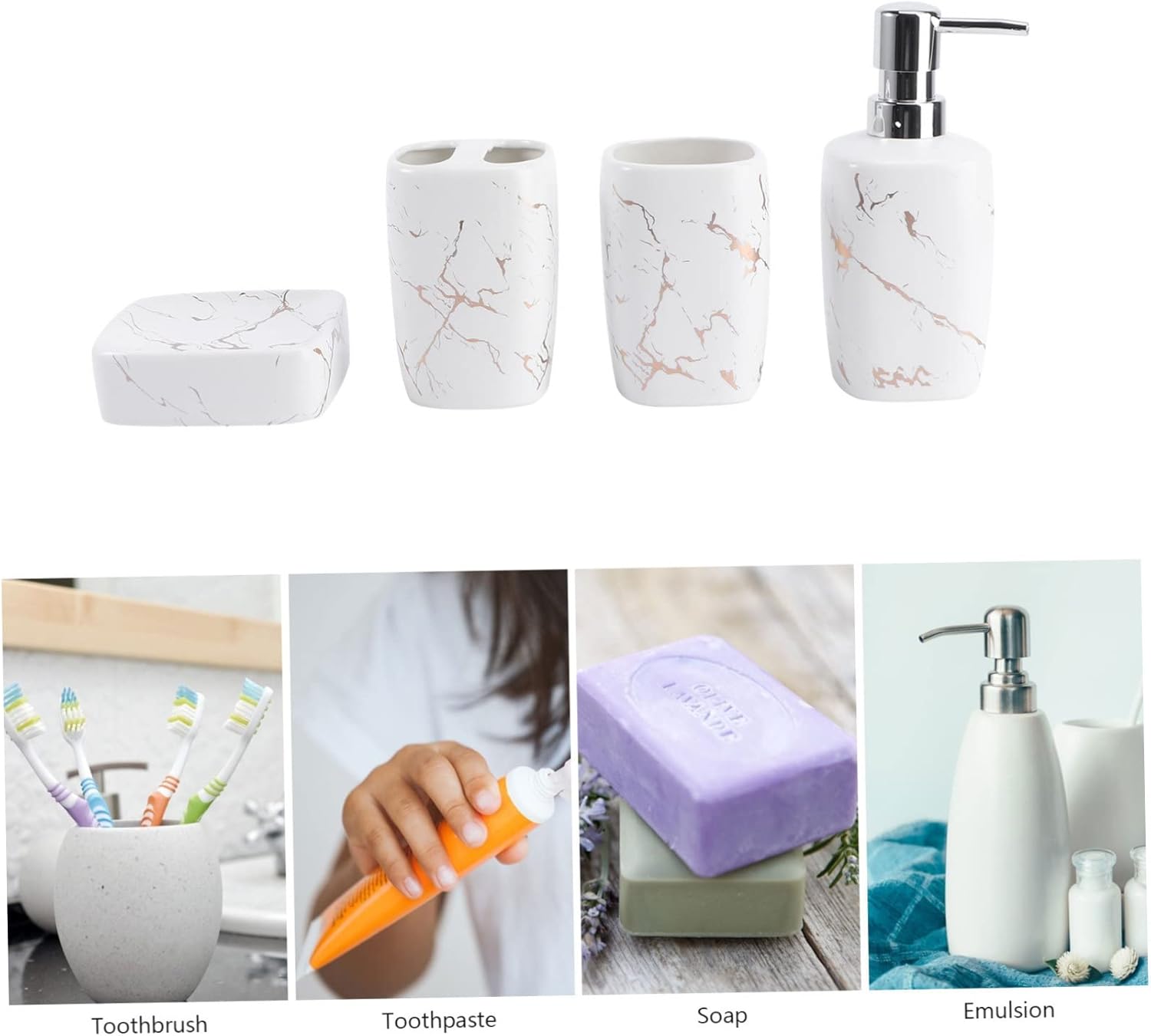 Package Include 1 x Lotion Bottle 1 x Soap Dish 1 x Mouthwash Cup 1 x Toothbrush Rack Characteristics -Size Lotion Bottle (350ml): 17.00X7.50X7.50cm/6.68X2.95X2.95in toothbrush tray -Size Toothbrush Rack: 11.50X7.50cm/4.52X2.95in toothbrush cup -Size Soap Dish: 10.80X3.40cm/4.25X1.33in toothbrush holder for bathrooms -Size Gargle Cup (350ml): 11.00X7.50cm/4.33X2.95in -Material: Ceramic -Easy to clean, , stylish, comfortable and bathroom toothbrush holders. -Suitable for the use in the hotel or home. Smooth surface, very convenient to clean. -A must-have accessory for your home, which is convenient and . items are made of , which is and . -Share with your friends and family as they are wonderful housewarming .Goods Descriptiontoothbrush holder for bathrooms Due to the design, they are wonderful for home bathroom use.toothbrush cup It helps you keep your soap, toothbrushes and toothpaste clean and tidy.toothbrush tray Are you looking for some personal washing accessories? These items will be a .bathroom toothbrush holders This is a set of accessories