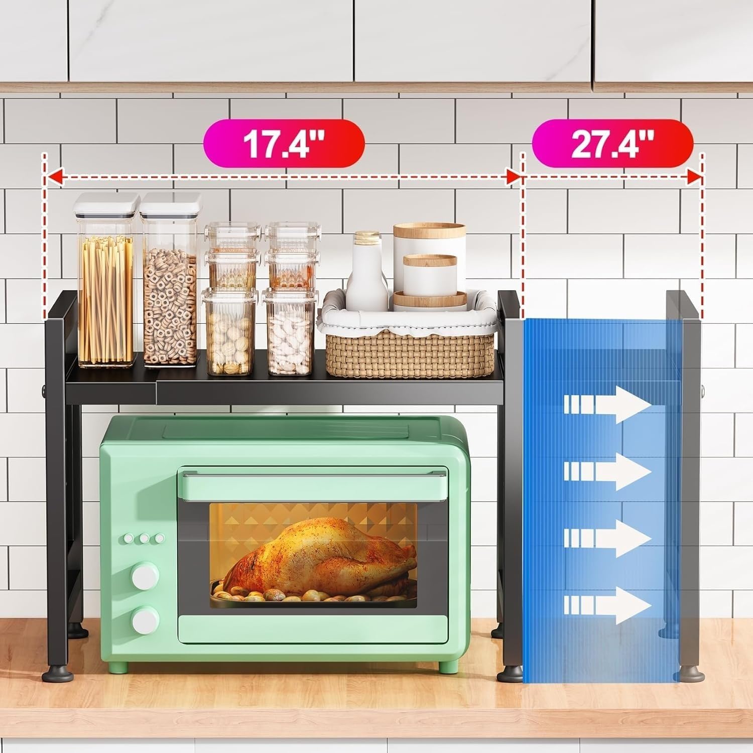 Multi-Function: The shelf is suitable for your kitchen, wardrobe, garage, shower room, and other storage areas. The 3 removable hooks included are a bonus to store oven mitts, kitchen utensils, or hand towels.Specification:Material: SteelColor: BlackSize: 17.4-27.4*12.8*17.2inPackage Including:1× Microwave Oven Rack