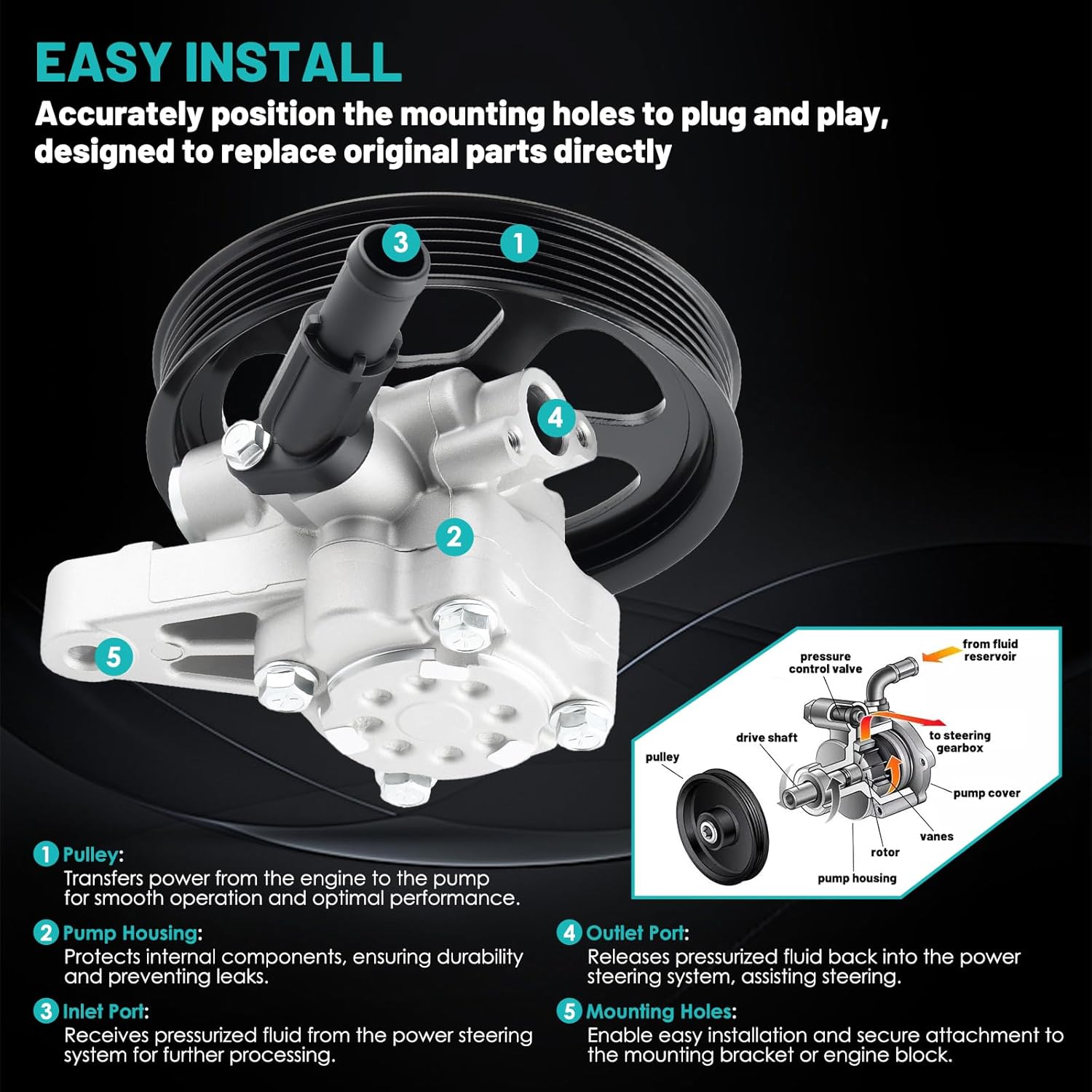 Upgrade Your Vehicle's Steering Performance with the 21-5290 Power Steering PumpPart Number:21-5290, 215290, 06561P8E505RM, 56100PVFA01, 56100PVFA01RM,56110P8EA01, 56110PGKA01, 55-5706, 55-5709, 555706, 555709, PSP1087Power Steering Pump Feature:Effectively reduce resistance to the steering wheel, making the driver easier.Made of alloy and plastic, test before delivery.Sophisticated design can match your power steering pump.Find the failed part, directly replace the new power steering pump.Compatibility:1999-2003 for Acura TL 3.2L 3210CC V6 GAS SOHC Naturally Aspirated2001-2002 for Acura MDX 3.5L 3471CC V6 GAS SOHC Naturally Aspirated2001-2003 for Acura CL 3.2L 3210CC V6 GAS SOHC Naturally Aspirated2003-2004 for Honda Pilot 3.5L 3475CC V6 GAS SOHC Naturally AspiratedNote: This list is a sample of all the compatible cars for this part. Make sure this product fits your car by using the part finder above.Why choose Farrme Power Steering Pump with Pulley:1. Superior Quality: Farrme 21-5290 power steering pump is built with exceptional quality and durability, ensuring long-lasting performance and reliability.2. Efficient Steering Performance: Farrme pump generates the necessary hydraulic pressure to provide efficient and responsive steering assistance, making your driving experience smooth and precise.3. Enhanced Reliability: We prioritize reliability in our product design, minimizing the risk of sudden failures or leaks, allowing you to drive with confidence and peace of mind.4. OEM Part Number: This 21-5290 power steering pump is designed and manufactured with OEM standards.5. Direct Replacement: This steering system pump is a direct replacement product. If your original power steering pump is failing or leaking, this replacement steering pump could be your best choice.6. Function: The power steering pump with pulley is designed to provide hydraulic assistance to the steering system, making it easier for drivers to turn their vehicle's wheels.7. Improved Steering Control: The power steering pump enhances steering control by supplying pressurized fluid to the steering gear, reducing the effort required to maneuver the vehicle.IMPORTANT NOTICE BEFORE INSTALLATION:①Please verify your vehicle make, model, year, engine, and OEM part number before installation. Contact-us if you're unsure about compatibility.② Flush the entire power steering system thoroughly before installing the new pump. Contaminated fluid can lead to premature failure.③ Always replace old O-rings and seals on both high-pressure and return hoses. Reusing worn seals can cause external leaks.④ Use only the manufacturer-recommended power steering fluid. Mixing fluid types can damage the system.⑤ Do not overtighten mounting bolts. Excessive torque can crack the pump housing.⑥ Bleed air from the system by turning the steering wheel fully left and right several times before starting the engine, then repeat after startup.⑦ Professional installation is strongly recommended. Improper installation may lead to noise, leaks, or loss of power assist.Signs of a faulty power steering pump(aka: "power assit pump" or "vane pump") include:① steering fluid leaks② squealing noise when steering③ heavy and jerky steering④ metal flakes in the fluid⑤ power steering symbol on dashboardPrecautions for installation:About Noisy:Check whether the resistance of the suction pipe is too high.Check whether the pressure adjustment of the safety valve is too high.The gas in the pump must be evacuated, check the tightness of each joint, prevent air from entering.About Leaking:Check whether the pipes and pipe joints are damaged.Tighten the fixing screws of the booster pump.Check, clean or replace the filter device, keep the oil circuit unblocked, and avoid the valve core being blocked by foreign matter.How to install the power steering pump:1. Ensure the vehicle is stationary and disconnect the negative terminal of the battery.2. Locate the original power steering pump, typically located near the front of the engine, close to the crankshaft and steering system.3. Using the appropriate tools, loosen and remove the belt from the original power steering pump, making a note of the belt's routing for future installation.4. Unbolt or remove the fastening screws of the original power steering pump and take it off the vehicle.5. Align the new power steering pump with the corresponding bracket or base on the vehicle and secure it in place using bolts or fastening screws.6. Install the belt correctly on the new power steering pump, following the routing recorded from the original pump.7. Ensure the belt is properly tensioned.8. Check the tightness of all installed bolts or fastening screws to ensure the pump is securely mounted.9. Reconnect the negative terminal of the vehicle's battery.10. Start the vehicle and check if the power steering pump operates smoothly without any abnormal noises or fluid leaks.