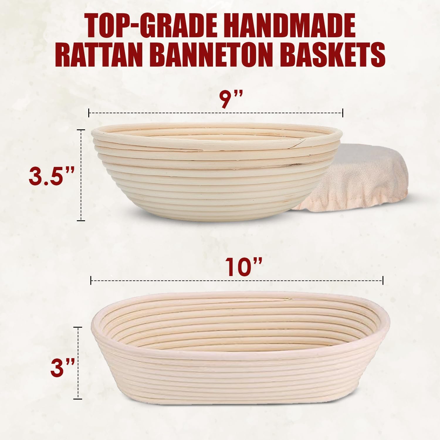 | Additional Features | Glass sourdough starter jar with breathable linen cover, temperature strip and day band, 9-inch round and 10-inch oval bread proofing baskets with liners, scoring lame with extra blades, silicone sling, and cleaning brush |