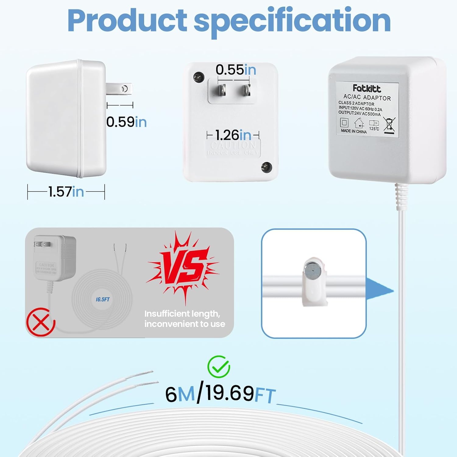 Introducing the Upgraded FATKITT 24V AC Power Adapter: Extended Reach, Enhanced Power Meet the next evolution in reliable smart home power. Built on our legacy of dependable transformers, this 24V AC adapter is engineered with a longer 6-meter cable and increased voltage to support the latest high-performance video doorbells and thermostats, ensuring they operate at their best. Engineered for Today's Power Demands 24V AC, 500mA Output: Provides ample, stable power for feature-rich devices that demand more energy for continuous video streaming, bright LEDs, and constant connectivity, preventing under-voltage issues. Extended 6-Meter (20ft) Cable: Offers exceptional installation flexibility, allowing you to route power cleanly from an interior outlet to your exterior doorbell or thermostat location with ease. Simplified Secure Connection: Ready-to-use stripped wire ends ensure a versatile and firm connection to standard screw terminals, aided by included cable clips for a tidy, secure wire run. Comprehensive Safety: Encased in a flame-retardant shell with built-in electrical safeguards to protect both the adapter and your connected devices. Broad Compatibility This versatile adapter is designed to power a wide array of devices, including but not limited to: Video Doorbells: All Ring Video Doorbell models (Pro, 3, 4, Plus), Nest Hello, Eufy Wired Video Doorbell, Arlo Essential Wired, Wyze Video Doorbell, SimpliSafe, and most other 16-24VAC doorbells. Smart Thermostats: An ideal C-Wire power supply for Nest, Ecobee, Honeywell Home, Emerson Sensi, and other 24VAC Wi-Fi thermostats. Technical Specifications Input: 120V AC, 60Hz Output: 24V AC, 500mA (12W) Cable Length: 6 Meters / 20 Feet Connector Type: Stripped and Tinned Wire Ends Package Includes: 1 x FATKITT 24V AC Power Adapter, 12 x Cable Mounting Clips The FATKITT Assurance We are committed to delivering robust power solutions backed by thoughtful design and reliable support. This adapter represents our focus on creating products that provide a seamless and enduring foundation for your smart home. Choose a power source that grows with your needs. Choose FATKITT.