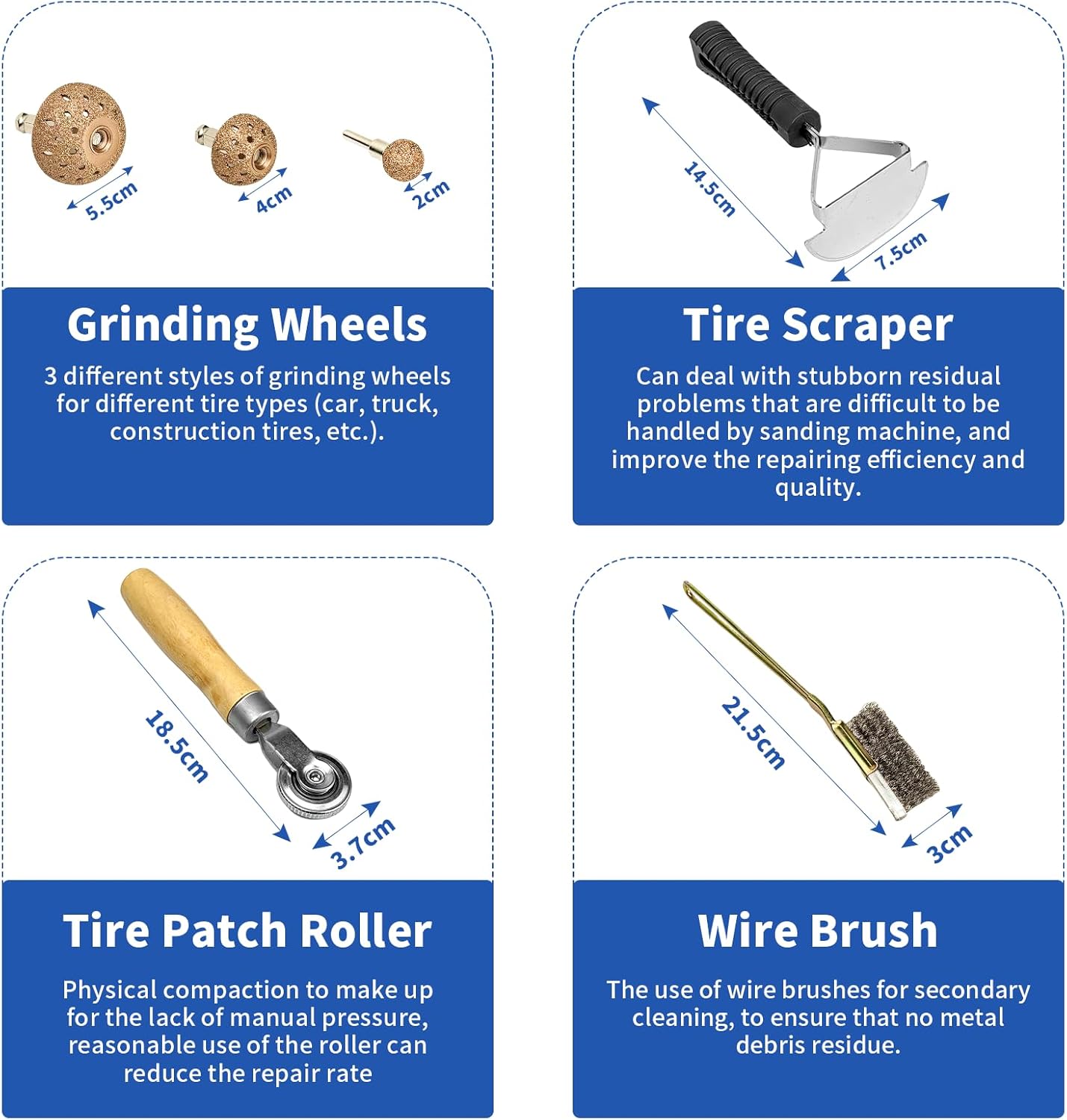 Ideal for grinding and polishing tire surfaces, rubber products, hardware, and even stone. The kit is perfect for both professionals and hobbyists who need a reliable tool for effective tire reaming, polishing, and patching. It’s versatile enough for general tire maintenance and repair tasks, providing lasting results.