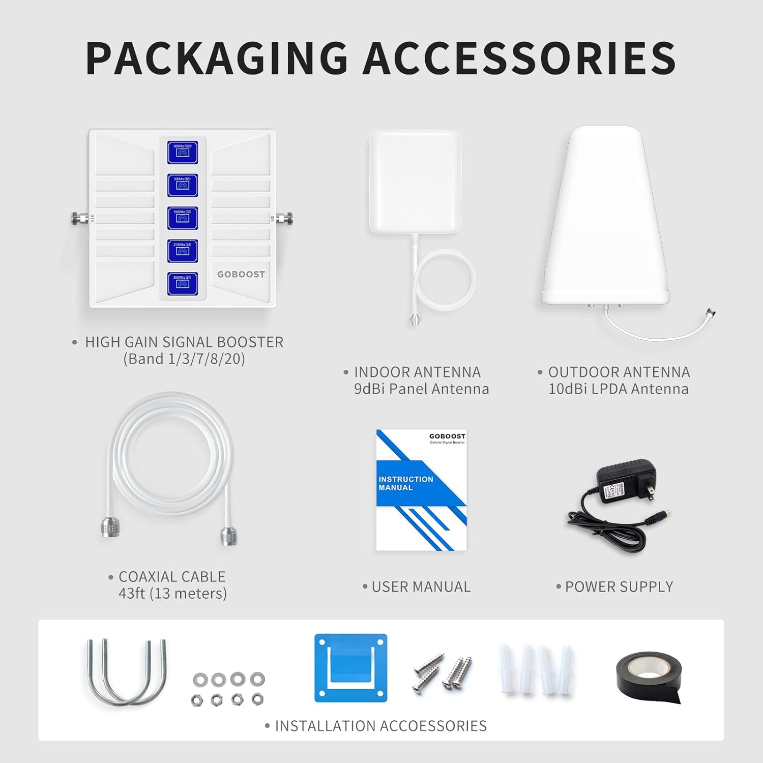 | Whats in the box | 1 * 13 Meters (43 feet) Coaxial Cable, 1 * Cell Phone Booster, 1 * LPDA Antenna, 1 * Panel Antenna, 1 * User Manual |