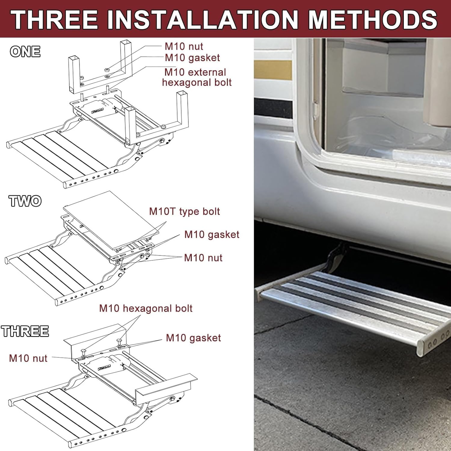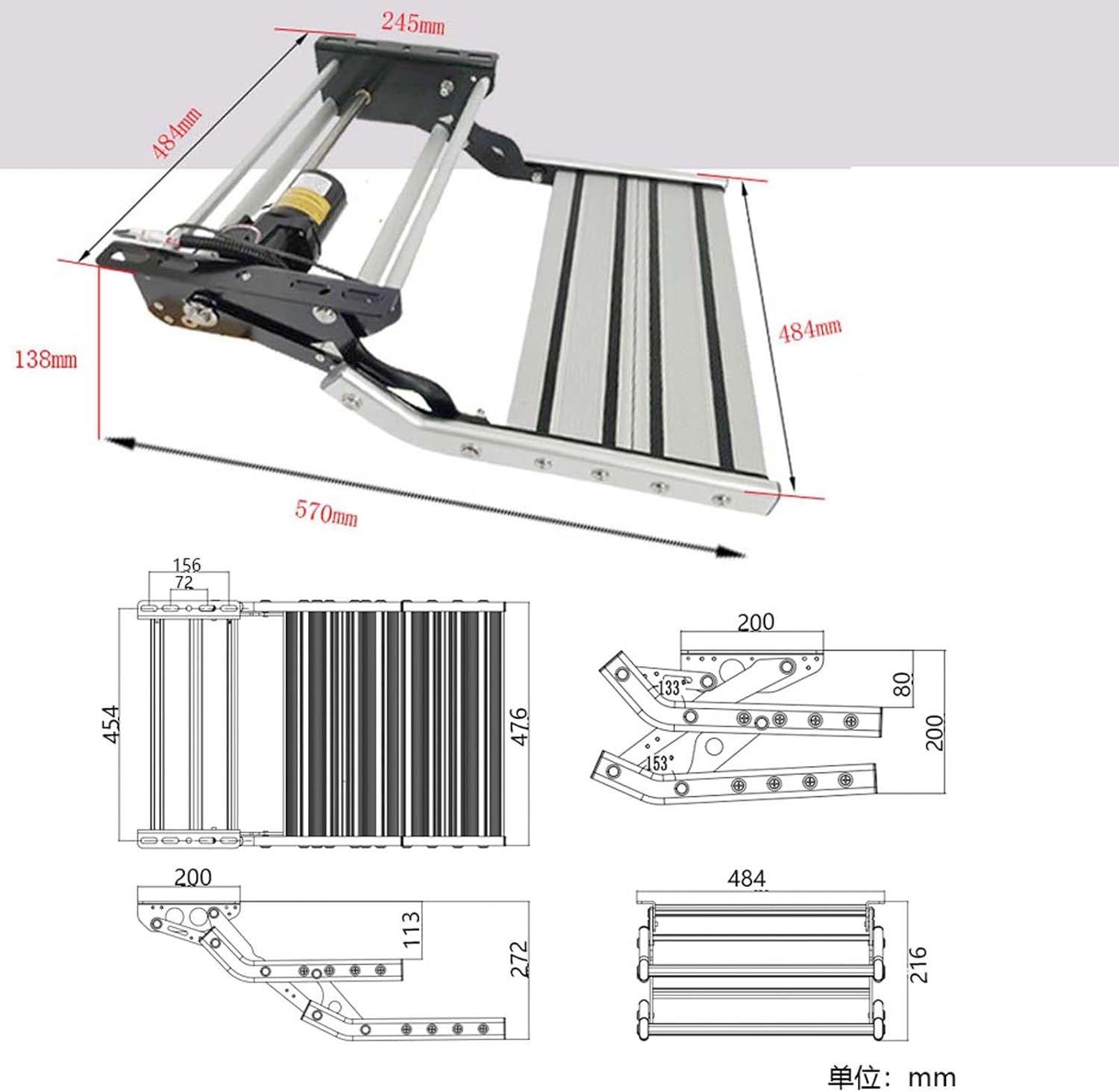 Product specificationsName: RV welcome folding stepsMaterial: aluminumAnti-slip strip material: silicon carbideMaximum capacity: 200kgDimensions (length*width*height):Single layer: unfolded size: 500*484*183mm; folded size: 393*484*144mmStandard packing list:1 x folding step1 x installation kit