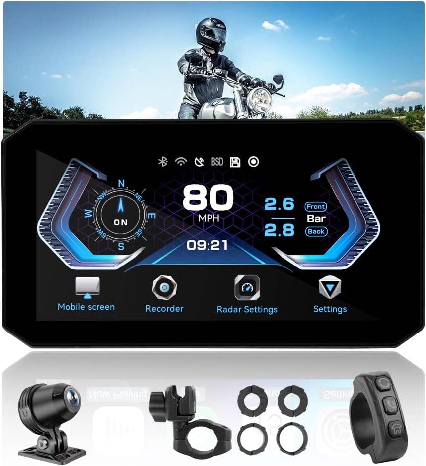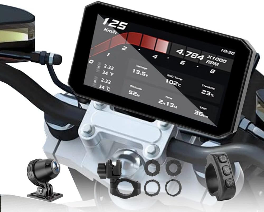 • - IP67 Waterproof & All-Weather Durability: Engineered with IP67 professional waterproof and dustproof rating, plus anti-shock and anti-vibration construction, this motorcycle screen performs stably in harsh conditions including heavy rain, strong sunlight, dusty roads and bumpy terrains. The sunlight-readable display ensures clear visibility even in direct daylight, supporting year-round outdoor riding without performance issues.