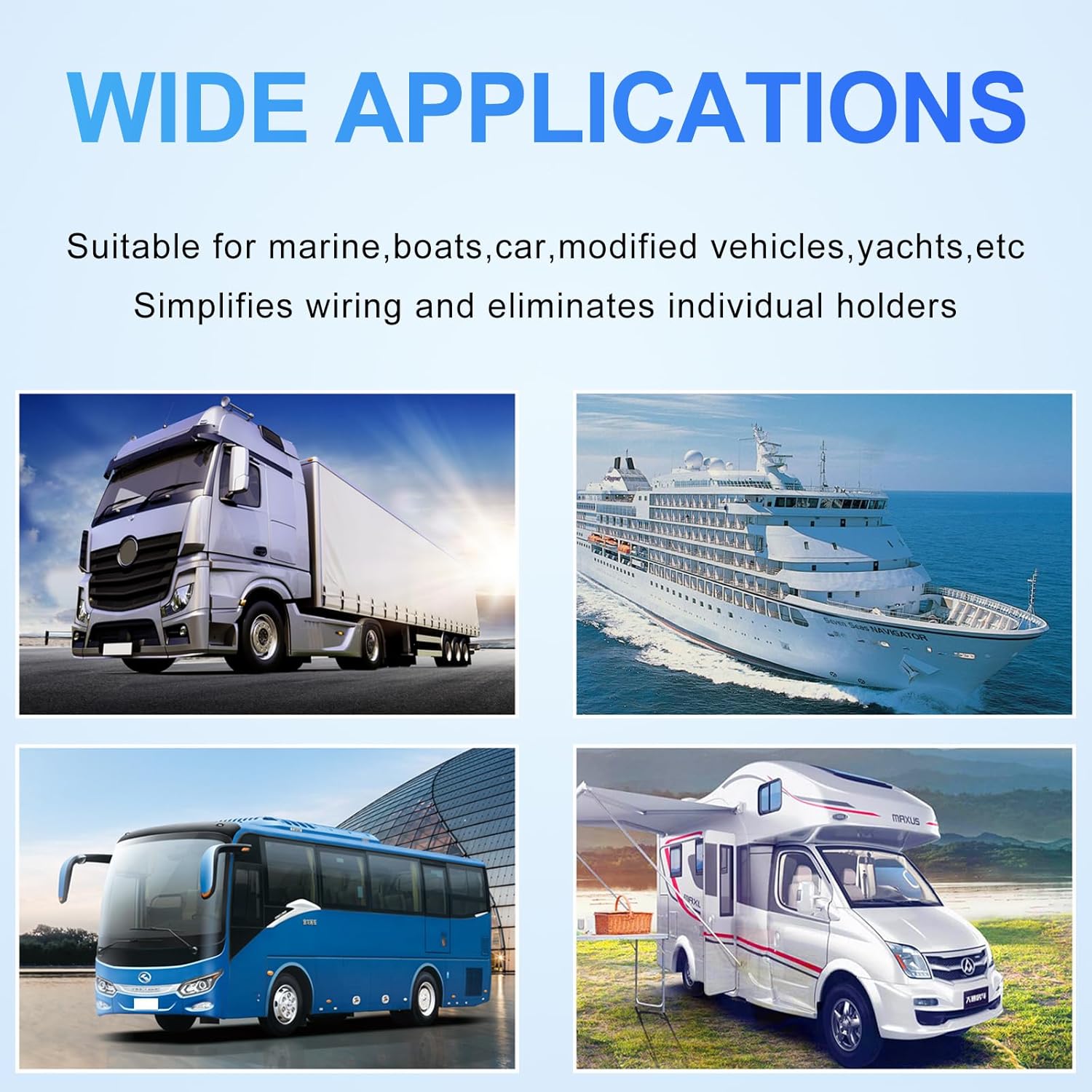 This fuse box is made of sustainable PBT and PC materials, with a maximum current of 100A per fuse box and 30A per circuit, and a maximum voltage: 32V DC. This fuse box can power new accessories on your boat or car, and can be used in gasoline engine compartments.