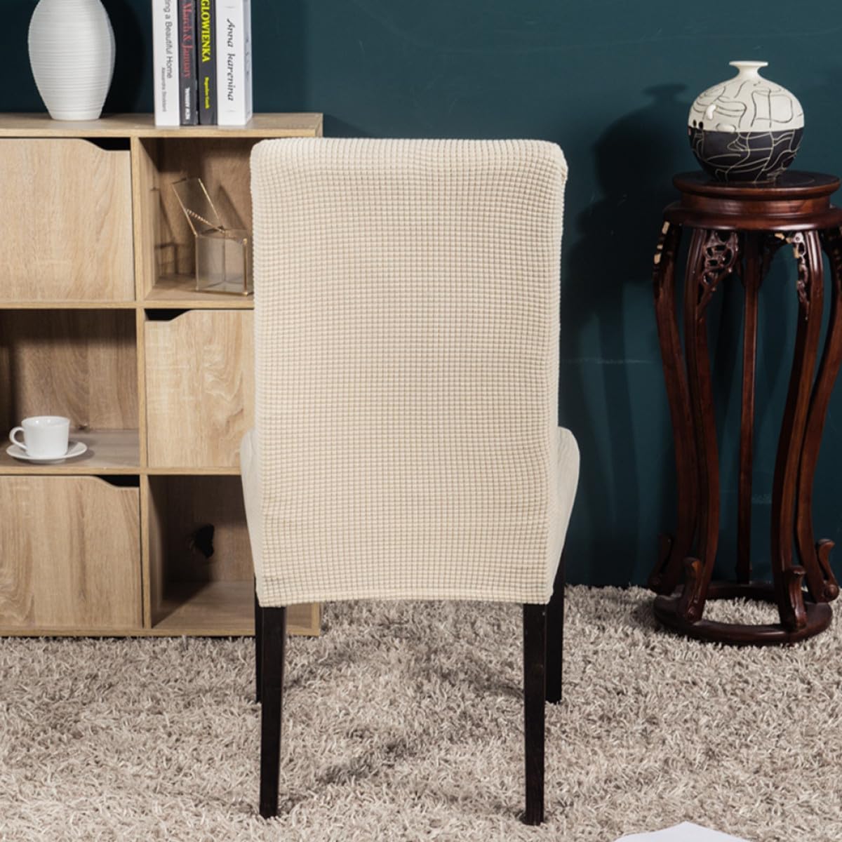Package List 6 covers Features - Color: beige. - Size: 55x49x49cm. - Material: Polyester, spandex. - Suitable for Chair Size: Thickness of chair back: within 10 cm; Chair Back Height: 46-55cm; Chair Back Width: 36-48 cm; Seat Length: 38-49cm; Seat Width 38-49cm. -Product Info:Dining chair cover - It is suitable for most of dining room chairs, chairs, banquet chairs, folding chairs Elastic Cover. - Protect your chair , wet, scratch and etc Polyester Chair Cover. - Made of spandex and polyester, flexible enough for most of chairs Chair Protector. - Easy to clean, washable, convenient to use, foldable to storage. - Suitable various occasions, wedding, banquet, party, meeting, ceremony, etc.Goods InformationStretchy Chair Cover This chair cover is made of spandex and polyester, flexible enough for most of chairs.Polyester Chair Cover Not only can protect your chair , wet and scratch, also can decorate your chair so well.Elastic Cover With simple design, comfortable, wrinkle resistant, machine washable, easy to wash