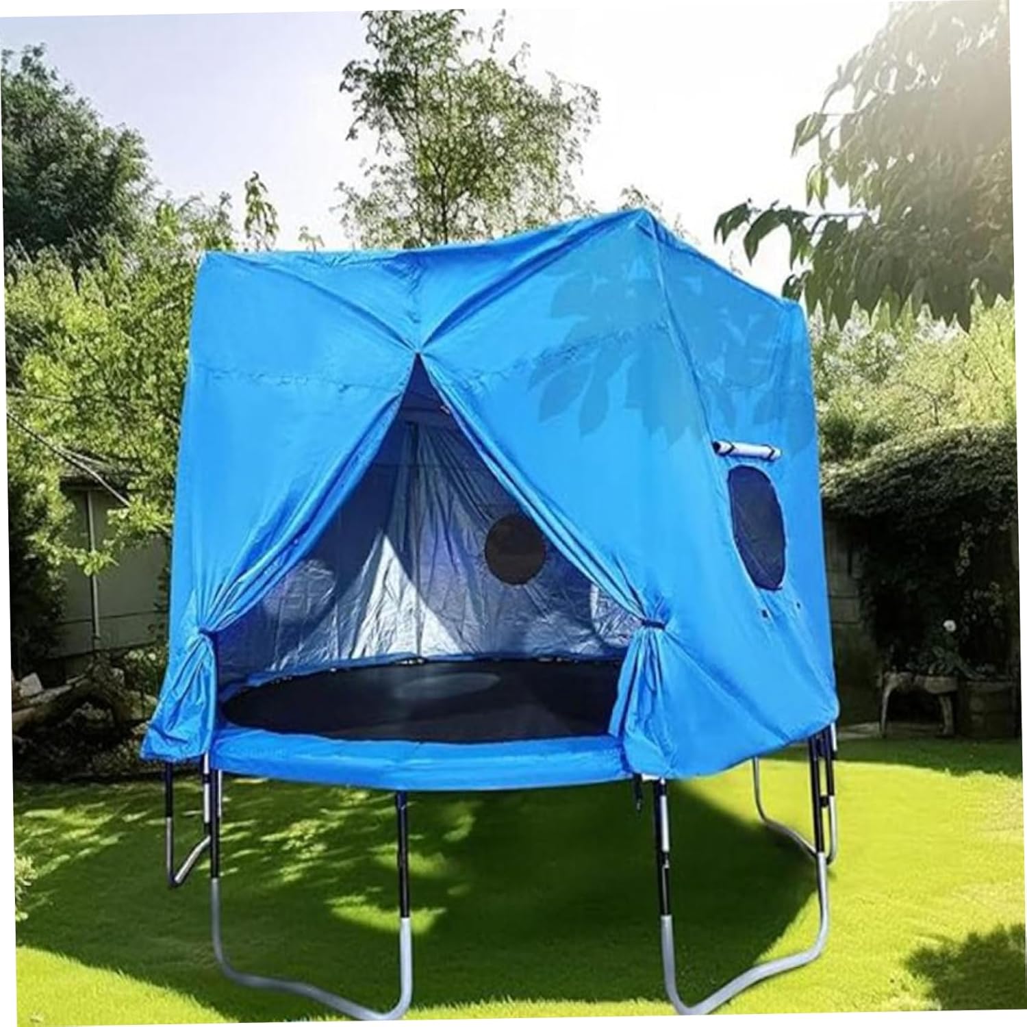 Description: This 8-foot trampoline cover is made from waterproof oxford fabric, water-resistant and sun-resistant, ensuring cooler, more comfortable jumping fun. Featuring a 360 comprehensive shielding design, this trampoline sunshade not only protects children from the harsh glare and heat of direct sunlight, but also ensures that the trampoline remains dry and clean. The trampoline tent is equipped with convenient side windows and skylights for natural lighting and ventilation, creating a bright and airy space for children. This trampoline canopy features a sturdy zipper and strap system that fits snugly over a 6-pole trampoline. Enhance your playtime with our 8ft Trampoline Sun Cover, Fit for 6 Straight Pole Trampoline, which provides versatile protection for indoor/outdoor fun. Features:. Trampoline Cover. -Color: Blue. -Material: Oxford cloth. -Size: diameter 2.44m/8ft. Note: Manual measurement, please allow slight errors on size. The colors may exist slight difference due to different screens. Package Including 1 * Trampoline Cover
