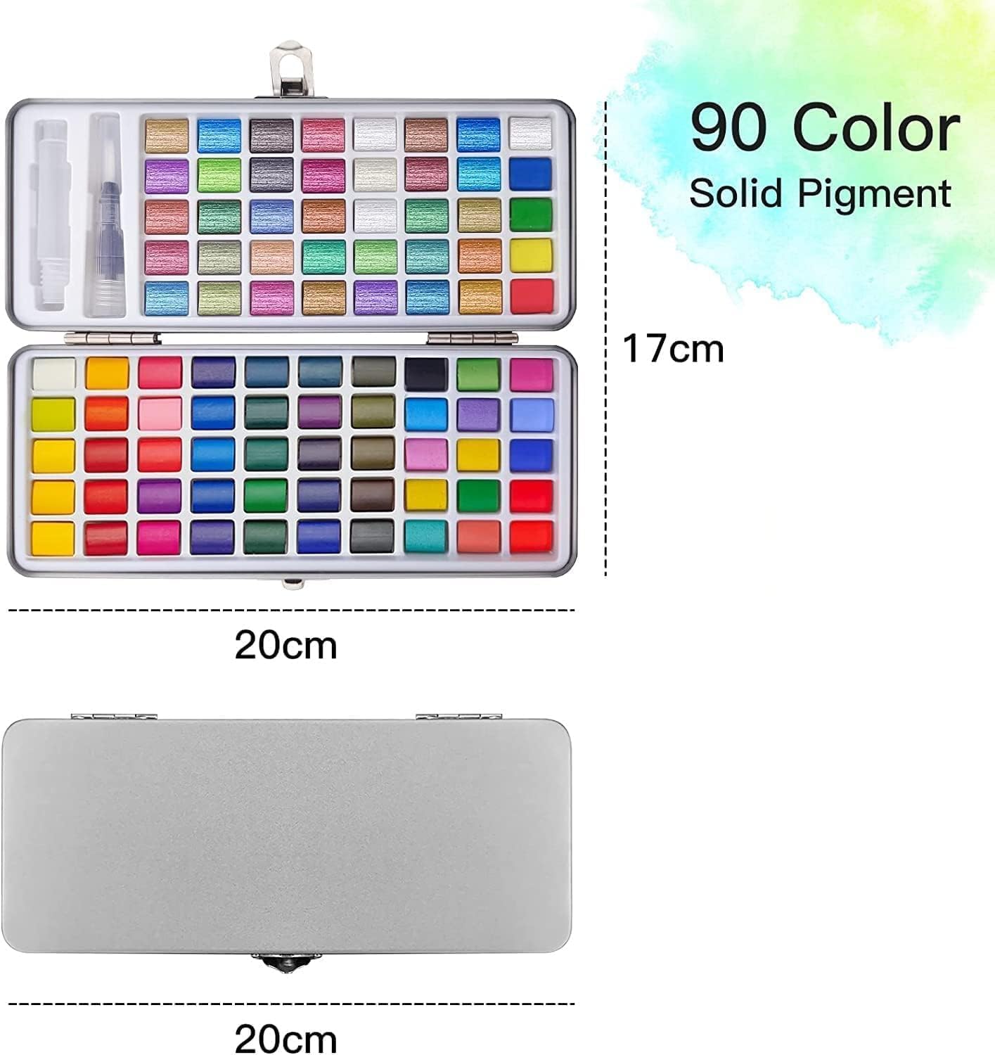 High-quality colours: the powder is preserved in our solid watercolour paints by fine grinding, increased consistency and pressing. These highly transparent, solid watercolour paints are durable and not easy to tear. They dissolve well in water, dry quickly, are moisture resistant and have excellent light fastness. The set of 90 includes: 50 Basic Colors 36 Shimmer / Metallic Colors 4 Neon Colors 1 x Water Brush 1x Portable Metal Case