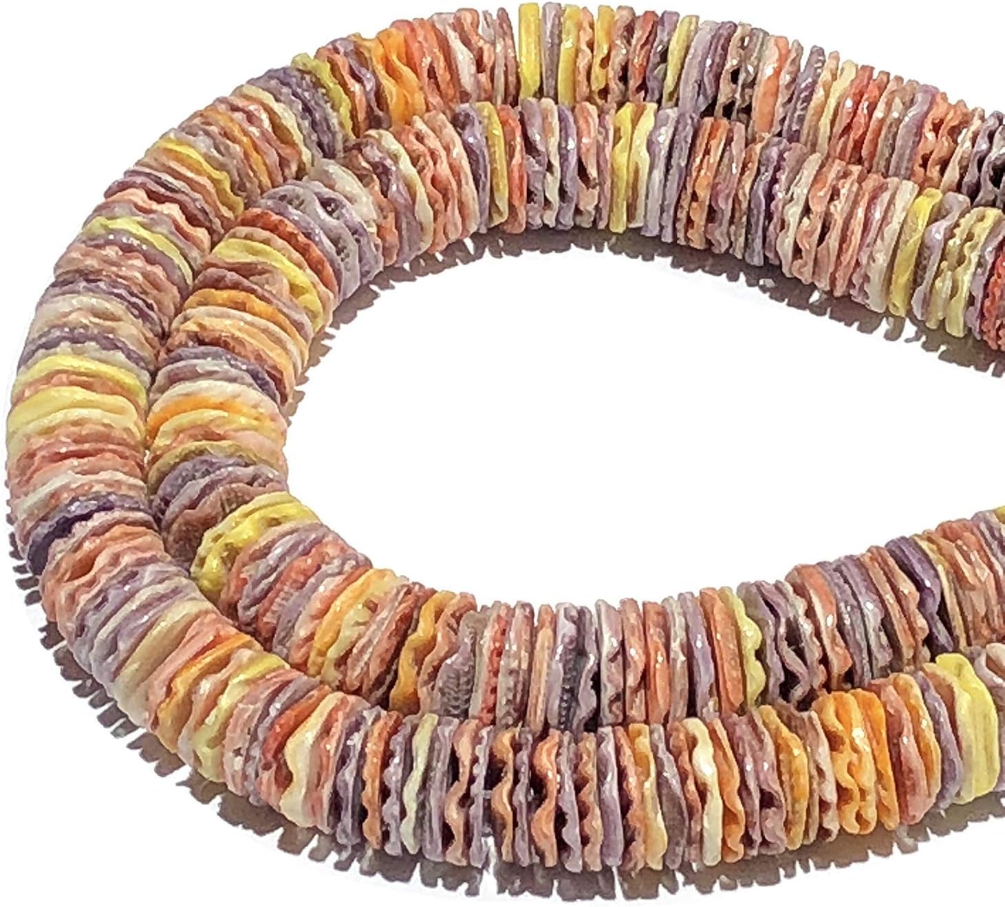 Elevate your jewelry designs with the rare beauty of our Sunrise Pectin Scallop Shell Beads — genuine Pacific Ocean treasures bursting with a natural kaleidoscope of warm colors. Each bead is carved from real scallop shell and features a stunning blend of oranges, corals, peaches, yellows, and creamy whites, creating an eye-catching spectrum that looks different from every angle. What makes these beads truly exceptional is their organic wavy texture, a natural ripple that adds depth, movement, and a soft shimmer as light travels across the surface. Carefully cut into heishi form and polished on all sides, these beads offer both vibrant color and a premium, handcrafted feel perfect for high-end jewelry. Every 15.5-inch strand is thoughtfully selected for color harmony while preserving the unique variations that make Sunrise Pectin so collectible. Ideal for bracelets, chokers, necklaces, anklets, and boutique resale, these beads instantly upgrade any design with tropical warmth and ocean-grown character. Whether you’re a designer, collector, or gifting these to a jewelry maker, this strand delivers rare natural beauty that surprises customers and transforms every piece into a one-of-a-kind masterpiece.