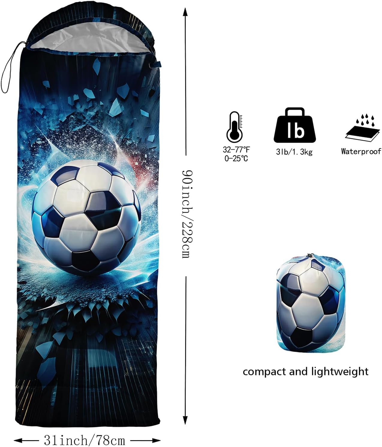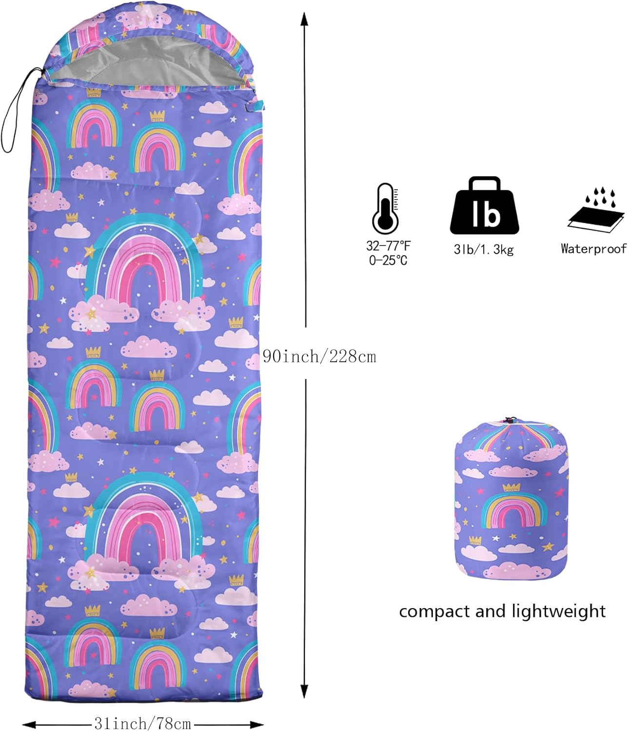 Welcome to AILONEN!Embark on the ultimate outdoor sleep experience with our high-quality sleeping bags. Designed to enhance your outdoor adventures, our sleeping bags feature waterproof double-layer technology for unparalleled comfort and moisture prevention.Size: Standard size: 1 sleeping bag (31"W x 90"L).Features:Clear and Vibrant Graphics: Experience the stunning graphics created by our advanced printing technology.Premium Microfiber Fabrics: Crafted from premium microfiber fabrics for exceptional warmth, breathability, and softness.Durable and Reliable: Reinforced stitching and sturdy weave guarantee long-lasting durability.Description:Easy Care and Portability: Machine washable in cold water and lightweight for easy transportation.Seasonal Versatility: Enjoy warmth and comfort during spring, summer, and autumn.Measurements: Slight error of 1-2cm due to manual measurements.Stylish Design: Our sleeping bags feature attractive patterns with realistic digital printing technology. Actual product color may vary slightly due to lighting and screen display.Sleeping Comfort: Designed to provide a rejuvenating night's sleep after camping, hunting, or hiking. Indulge in luxury, durability, and functionality.Exceptional Quality and Service: At AILONEN, we are dedicated to delivering high-quality products and excellent customer service. Choose us for a convenient and memorable outdoor experience.FIT Temp: 32°F-77°F (0°C-25°C)Outer Cover: Durable 210T nylonLining Material: Soft and breathable polyesterFilling Material: Hollow cottonPackage Weight: 3 lbs