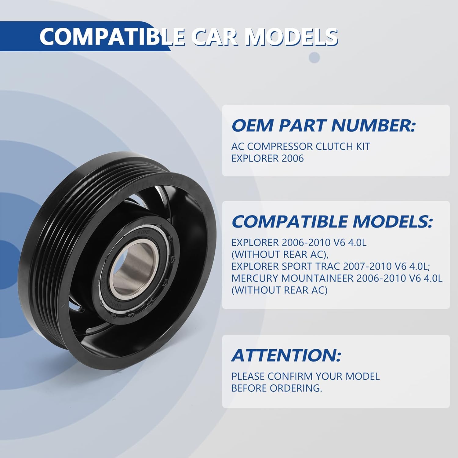 Item Type: AC Compressor Clutch Kit Condition: Brand New Quantity Sold: One Set Note-1: With FS18 Compressor Note-2: For Ford Explorer & Mercury Mountaineer fit Vehicle Without Rear AC Compatible Modle: Fit for Ford Explorer 2006-2010 V6 4.0L Vehicle Without Rear AC Fit for Ford Explorer Sport Trac 2007-2010 V6 4.0L Fit for Mercury Mountaineer 2006-2010 V6 4.0L Vehicle Without Rear AC Package: Part Kits Included: 1x Pulley With Bearing, 1x Front Plate, 1x Electromagnetic Coil Fitment Type: Direct Replacement. Please search online video for installation Warmly note:We are fully aware of the importance of every auto parts product to your driving safety, so we promise to provide 24-hour worry-free protection. Just contact us in time and our professional team will be there to support you at any time. If there are any quality problems with the parts you purchased, we will not hesitate to provide you with a full refund or replacement service