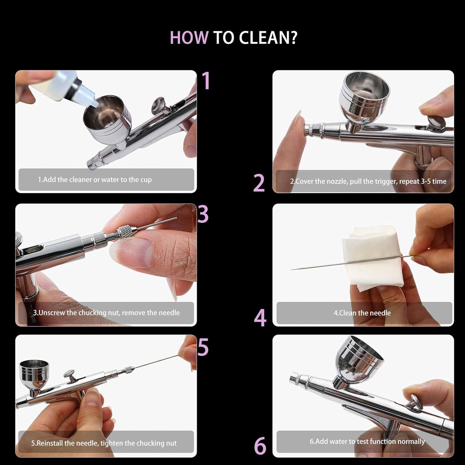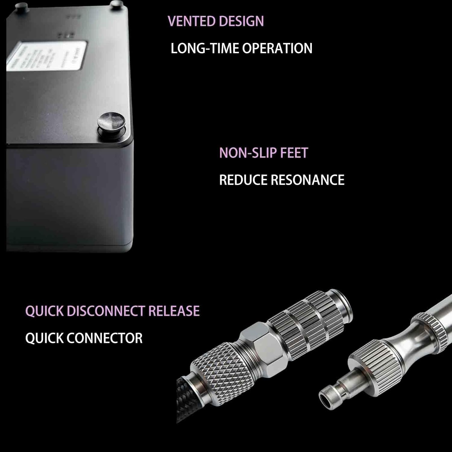 | Included Components | instruction manual, portable smart air compressor + 0.3mm dual action spray gun + 1.8m 1/8' air hose + 1.2m power adapter, replaceable needle + quick release connector + 2 holder + wrench + cleaning brush |