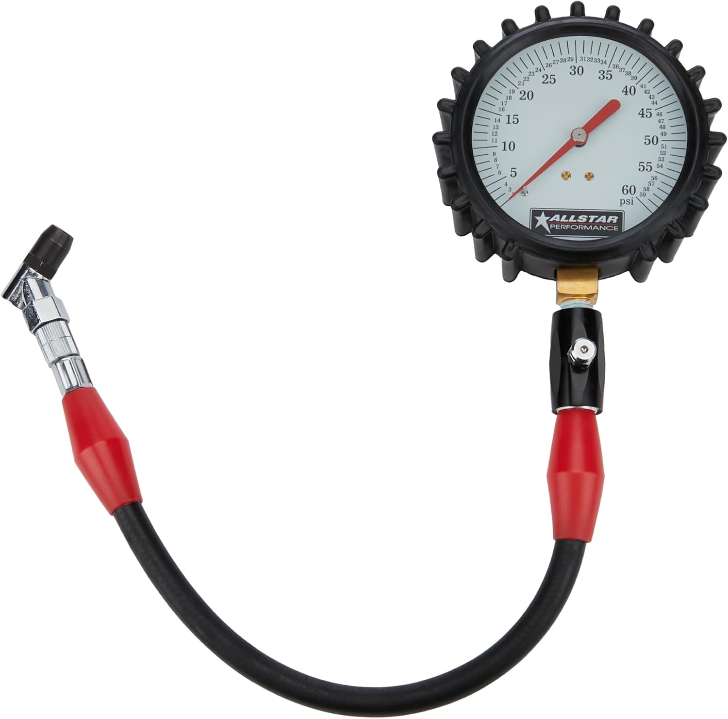 Tire pressure gauge has a glow in the dark face. Swivel chuck rotates 360 degrees on a 14" long rubber hose for easy placement on valve stems with leak free operation. A rubber cover surrounds the gauge for added protection against drops and has a ribbed molded pattern for increased grip. Gauge also features a built-in pressure release valve for removing air in small amounts for precise pressure adjustments.