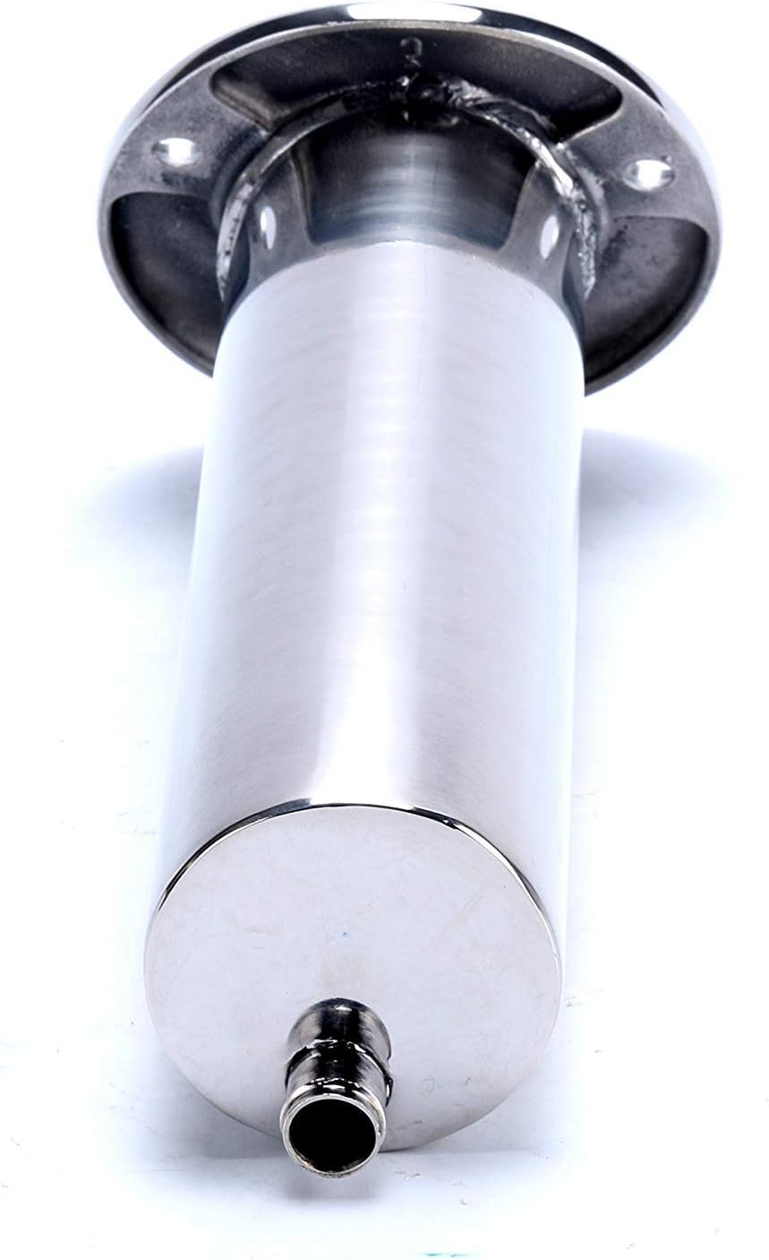 Complete with interior liner and barb for a drain hose. 30 degree, 15 degree, 90 degree angle. 2" outside diameter. 1 5/8" inside diameter. 9 inch length with stop pin. Flange footprint is 4 1/4 x 3 3/8 inches. Complete with interior liner and drain barb. Highest-quality, solid cast 316 stainless steel.Package4 X Rod holder