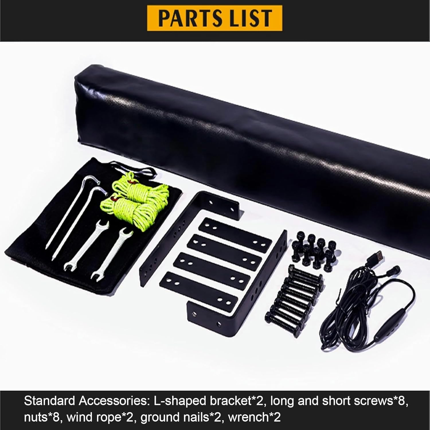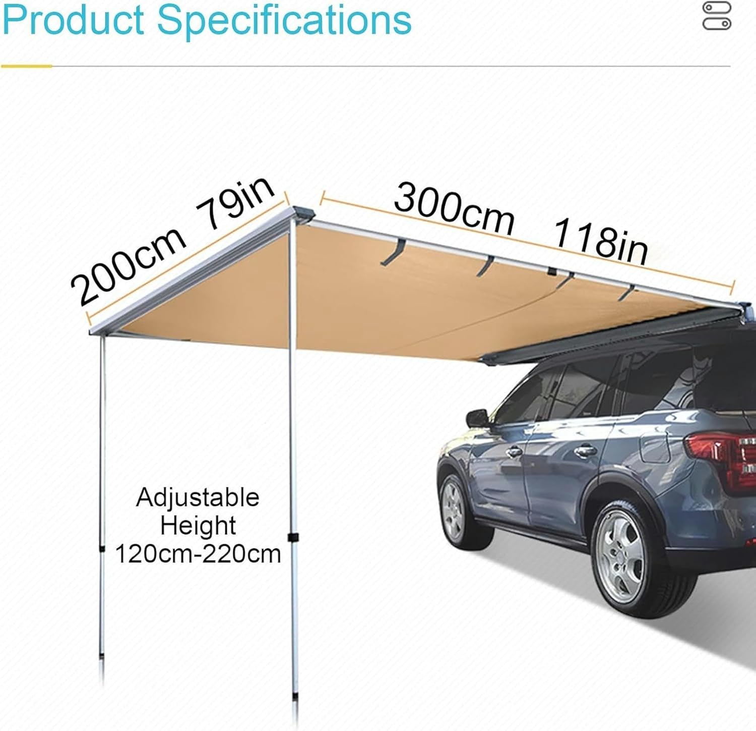 High qualityOur camping car awning is made of oxford 300d fabric and an outer cover of resistant PVC bag, with 5000 mm PU coating, which provides a powerful waterproof function and sun protection, stable structure of aluminum alloy, aluminum alloy,Hugging, long shelf life, firmly fixed to the vehicle.Do not move due to wind or other external factors, making your outdoor activities comfortable and safe.Installation requirementThis awning needs a baca for installation.It cannot be mounted on vehicles without one.Confirm that your car is equipped with a baca before making the purchase.SpecificationsSize: 200 x 250 cm (79 x 98 inches), 200 x 300 cm (79 x 118 inches)Post material: aluminum alloyFabrics: Oxford 300D fabricAdjustable height: 47 "to 86" (120 to 220 cm)Package content1 car awning.1 x accessories for tent1 x instructionHow to use the side store of the car1: After taking out the store, you must first fix with wind ropes.2: The rope must be tense and try to avoid sustaining the lateral store of the car with strong winds.3: Support feet must be firmly fixed.WarningTo prolong the useful life of the awning, check it out during strong winds or adverse climatic conditions and do not leave it outdoors all night.The dimensions are measured manually, there is an error of 0.1-0.3 ”, please understandIf you have any questions, contact us by email in time, we will answer within 12 hours!