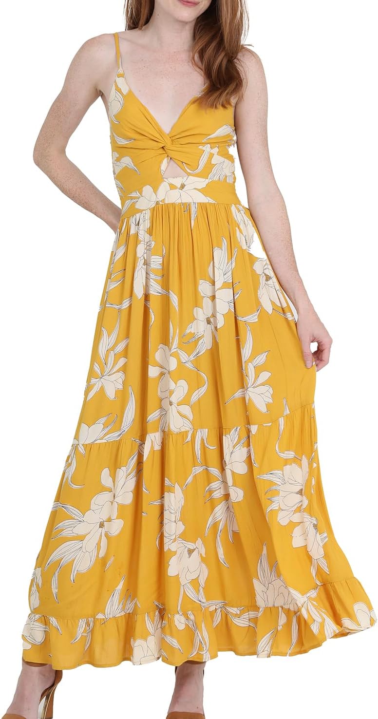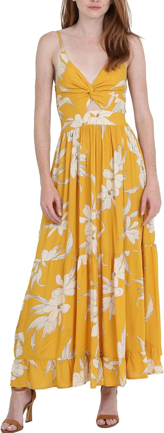 Angie Women's Peekaboo Tiered Maxi Dress features a gorgeous placement print. The twist front with peekaboo cutout is flattering and flirty. The loose fitted skirt adds comfort to the dress.