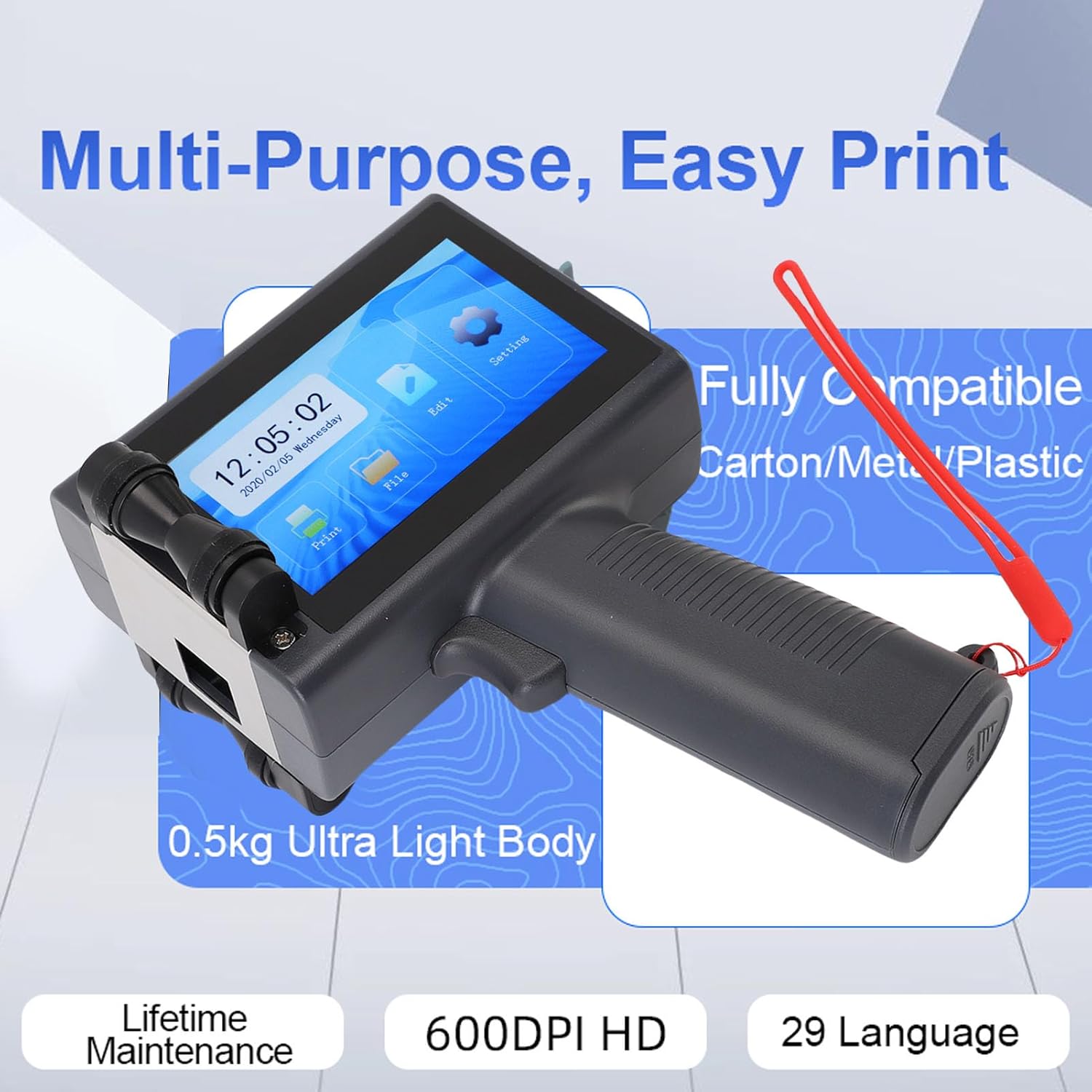 [Versatile Printing Capabilities] Print on virtually any including wood acrylic fabric paper plastic labels and leather. this multifunctional printer handles diverse content like dynamic qr codes serial numbers dates and custom graphics. with adjustable printing parameters for size type length width spacing and angle it meets all your industrial commercial and creative printing needs. [Intuitive Touch Screen] Experience smartphone like ease with the 4.3 inch led touch screen featuring a smooth user interface. the high resolution 600dpi display provides clear visibility while the 4 core cpu processor ensures fast responsive operation. designed for effortless control this portable printer simplifies complex printing tasks with its user friendly machineos operating system. [Customization & Connectivity] Easily import bmp images via usb and customize text dates counts and variable data. the printer supports 15 digit serial numbering and prints up to 1 meter in length. compatible with food grade water based and oil based inks it offers flexible printing solutions for various industries including food packaging cable marking and product identification. [High Printing] This advanced handheld inkjet printer delivers exceptional print quality with adjustable resolution from 300600dpi and a print height range of 212.7mm. its tij2.5 thermal foam print head ensures crisp accurate printing of text numbers symbols qr codes barcodes and images. the printer supports 15 lines of customizable content making it perfect for industrial packaging food boxes and product labeling. [Ergonomic & Portable Design] Designed for comfort and convenience this lightweight printer features an ergonomic grip and balanced weight distribution. the builtin 2500mah lithium battery enables cordless operation while the quick drying ink (210 seconds) boosts productivity. perfect for onthego printing in warehouses factories retail spaces and outdoor environments. Spec: Item