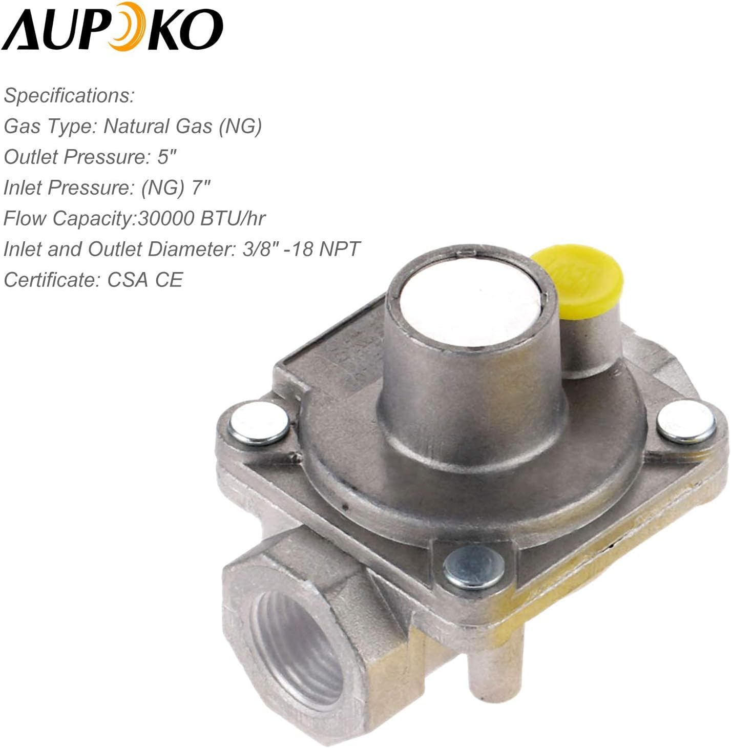 • Package Included --- 1pc x 3/8" NPT low pressure NG regulator, 1pc x gas line pipe thread tape. Outlet pressure: 5". Inlet pressure: (NG) 7". Flow Capacity: 30000 BTU/hr. Inlet and Outlet Diameter: 3/8" -18 NPT.