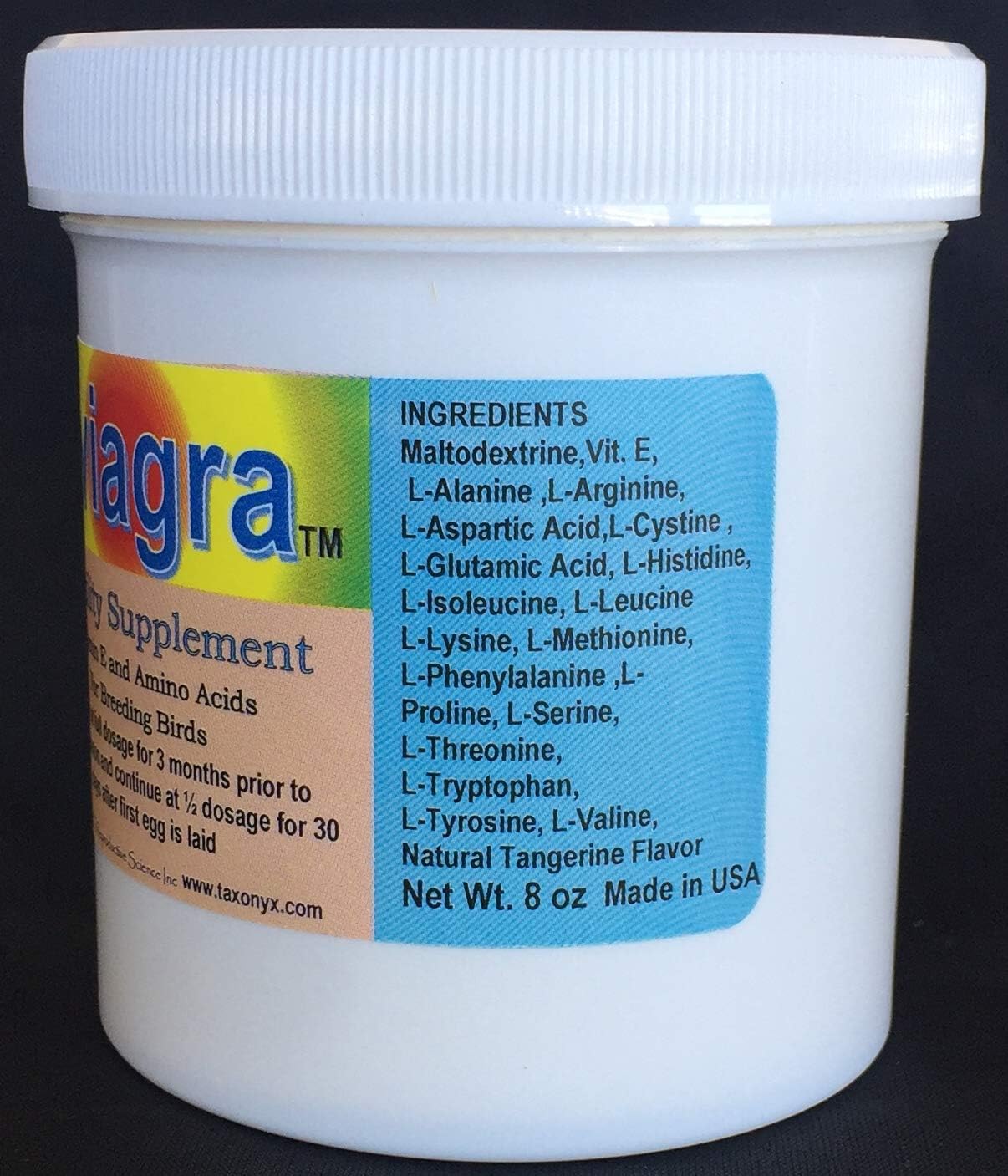 Aviagra Fertility Supplement: A special mixture of vitamin E and essential amino acids in a pleasant natural tangerine flavored base. Feed by sprinkling on soft food: fruit, vegetables, sprouts, etc. Good for all adult birds from canaries and budgies to amazons and cockatoos. Ingredients: Maltodextrine, Vit. E, (D, L, Tocopherol Acetate), L-Glutamic Acid, L-Leucine, L-Aspartic Acid, L-Lysine, L-Isoleucine, L-Alanine, L-Valine, L-Threonine, L-Serine, L-Phenylalanine, L-Proline, L-Arginine, L-Glycine, L-Methionine, L-Cystine, L-Histidine, L-Tryptophan, L-Tyrosine, Natural Tangerine Flavor.