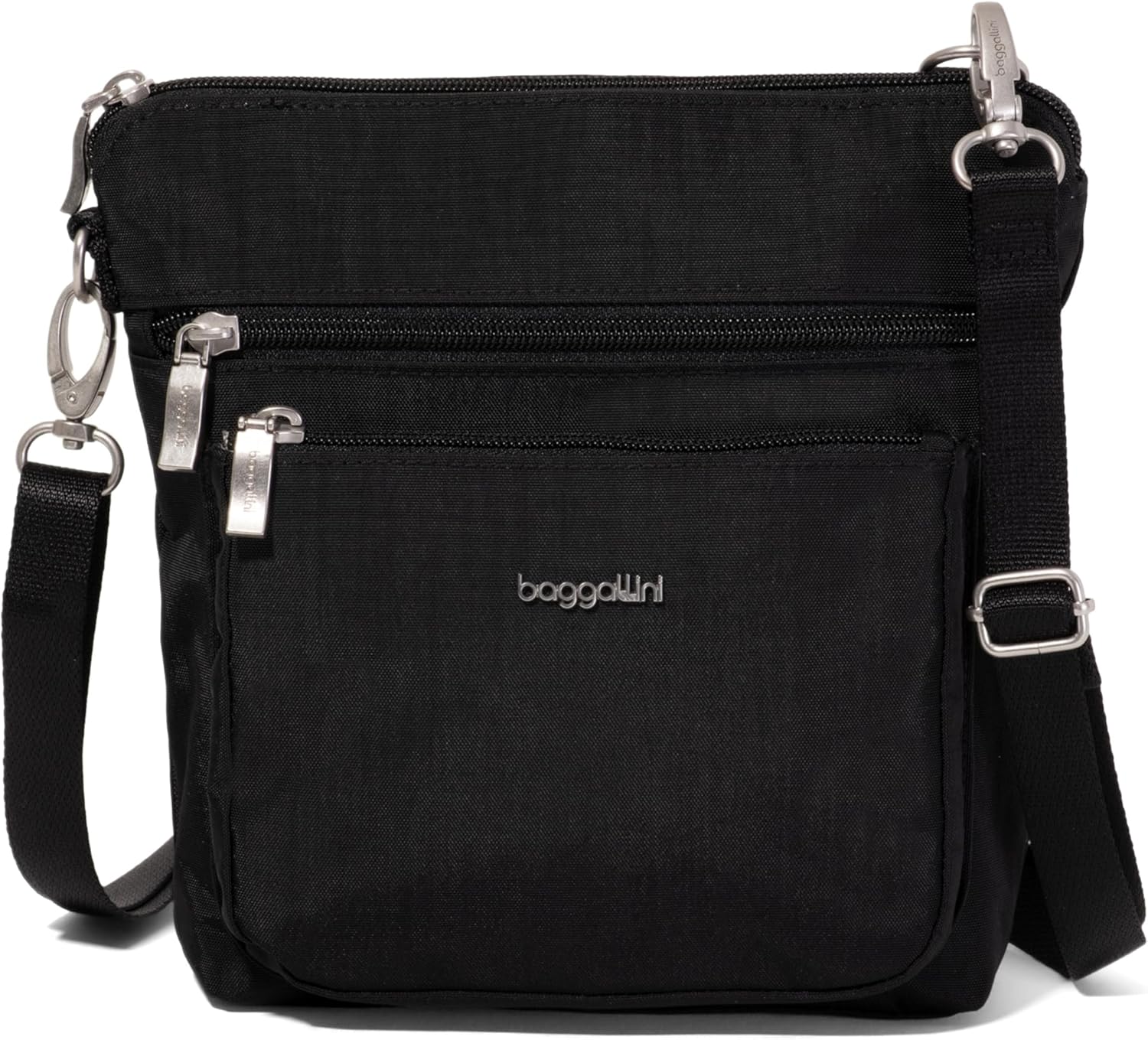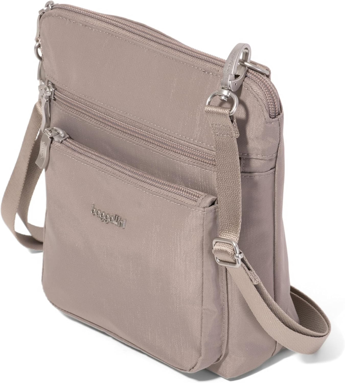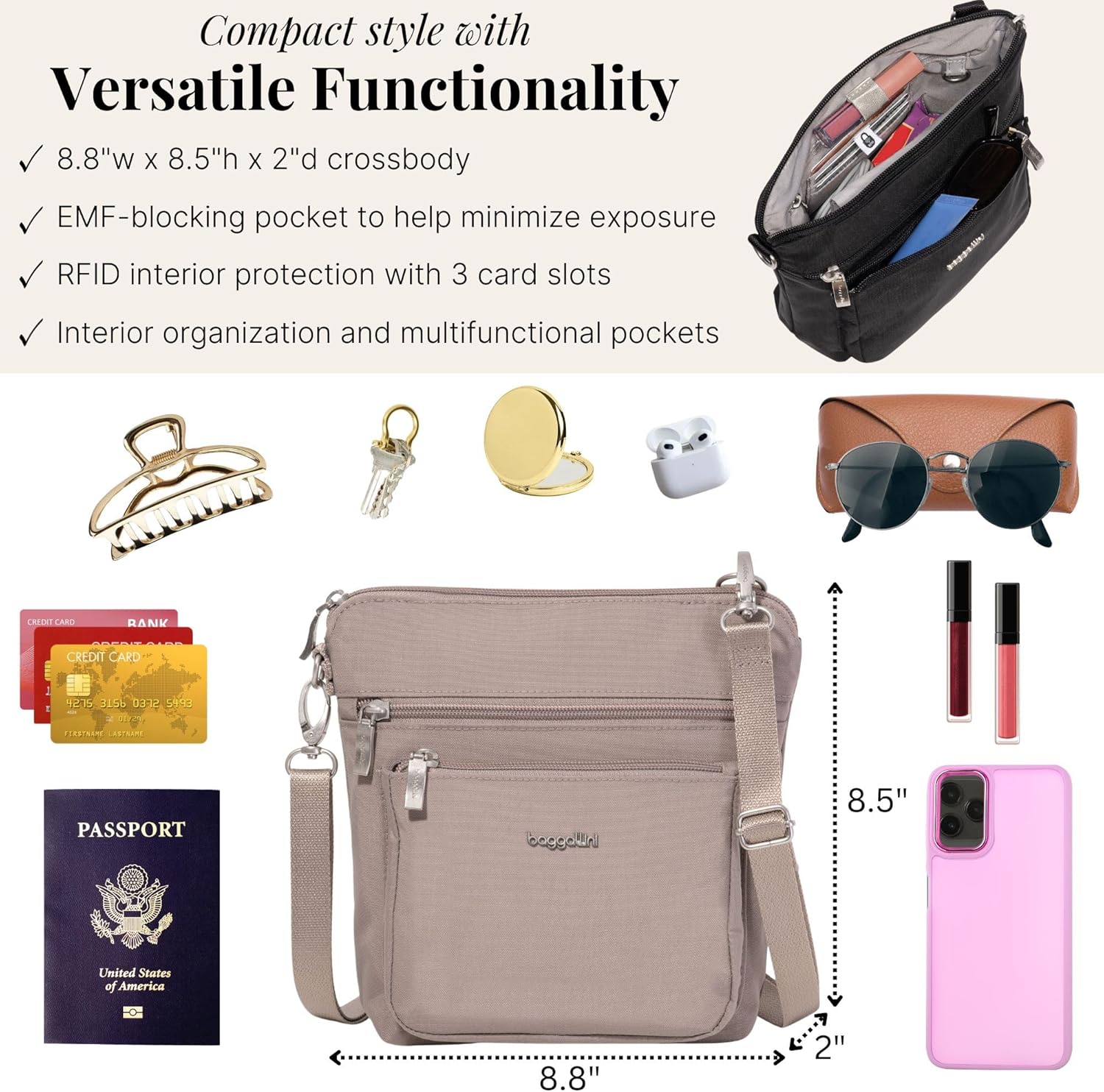 The Modern Pocket Crossbody, featuring an EMF-blocking pocket, is thoughtfully designed for life on the go. With three exterior zip pockets and an easy-access phone pocket, it keeps essentials close without slowing you down. Inside, RFID-protected card slots and an integrated EMF-blocking phone pocket add a layer of confidence to your carry. Whether you're commuting, traveling, or tackling weekend errands, this compact style makes staying prepared look effortless. Designed for busy days, travel adventures, and everyday errands, this women’s crossbody bag delivers lightweight comfort, smart organization, and modern protection in a compact silhouette. Whether you’re commuting, sightseeing, or heading out for the day, this lightweight travel purse for women keeps essentials secure and easy to access. The exterior measures 8.8" W x 8.5" H x 2" D with a 2.9 liter capacity and weighs just 11 oz, making it an ideal compact crossbody handbag, everyday travel bag, or hands-free purse. A 52" removable, adjustable crossbody strap allows customized wear, providing all-day comfort for walking, shopping, and travel. This RFID crossbody bag for women includes RFID interior protection with three card slots to help protect credit cards and ID during daily use and travel. An EMF-blocking pocket is designed to help minimize direct contact with everyday EMF exposure, adding thoughtful functionality to this modern women’s travel crossbody purse. The grab-and-go phone pocket allows quick access to your device and does not include EMF-blocking material, making it ideal for frequent phone use. Interior organization and multifunctional pockets keep your belongings neatly stored, while a key leash and lipstick loop add convenience for everyday carry. Designed to hold your phone, wallet, keys, and small essentials, this compact travel crossbody bag keeps everything within reach without added bulk. Perfect as a women’s travel bag, RFID crossbody purse, lightweight everyday handbag, or compact shoulder bag, this versatile style transitions seamlessly from travel days to daily life. Whether used for commuting, sightseeing, or casual outings, it offers comfort, organization, and peace of mind in a sleek, modern design.