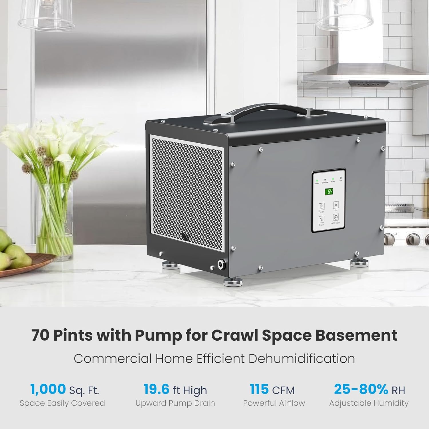 BaseAire70 Pints Crawl Space Dehumidifier with Pump for Commercial with Hanging Kit and Remote Controller