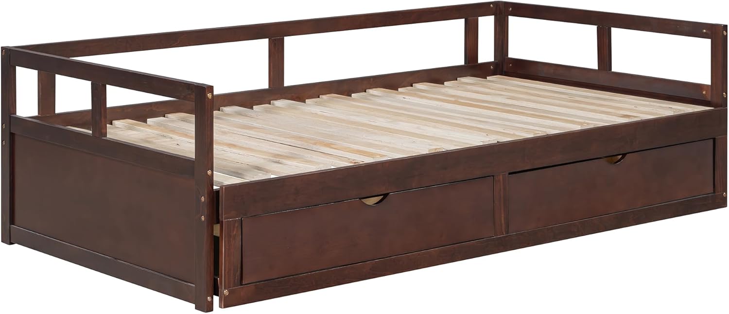 Bellemave Extendable Daybed with Trundle Bed and Two Storage Drawers, Wooden Storage Daybed, Twin to King Design Extending Bed for Kids Teens Adult, No Box Spring Required (Espresso)
