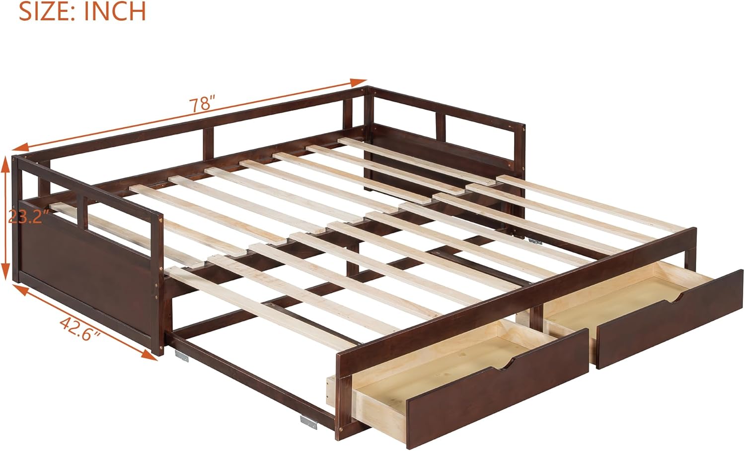 • 【Double Twin Bed Design】 When the trundle is pulled apart, this daybed can be expanded from twin size to King size. The twin size is suitable for children or daily use, but when the guests arrive, King size is the best choice. Overall Product Dimension: 78"L x 82.5"W x 23.2"H