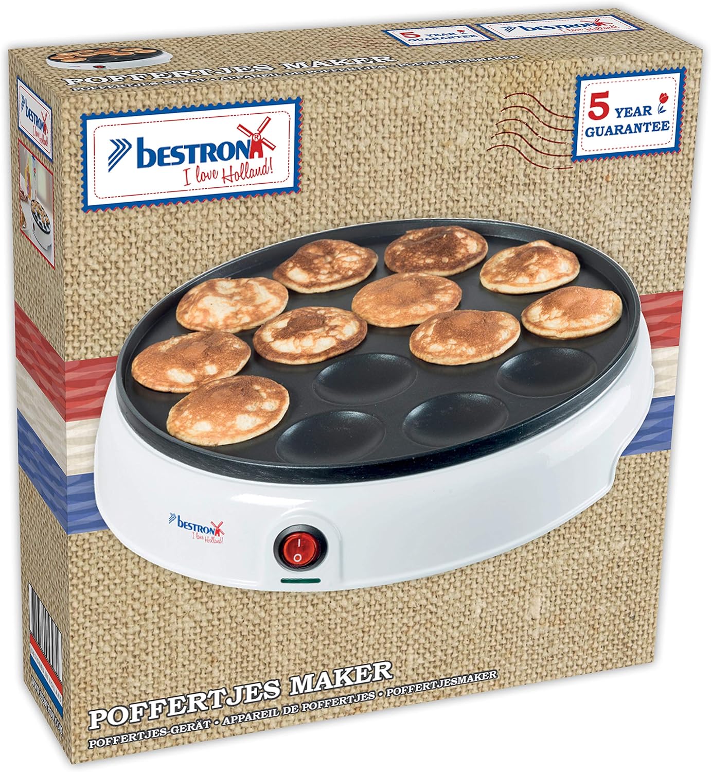 Decorative poffertjesmaker in I Love Holland design, for baking delicious Dutch poffertjes Perfect for children's birthdays. Quick heating element for the ideal temperature, for easy preparation of 14 golden brown poffertjes - recipes included. Non-stick coating for easy turning / removal of poffertjes and for easy cleaning, smart cable storage under the device. Safe placement thanks to non-slip feet - Heat-insulating housing and practical indicator light on the on/off switch. Scope of delivery: 1 Bestron poffertjes device, weight: 0.95 kg, lxwxh: 26x26x6 cm, material: plastic / metal / copper / rubber, color: white, APFM700W