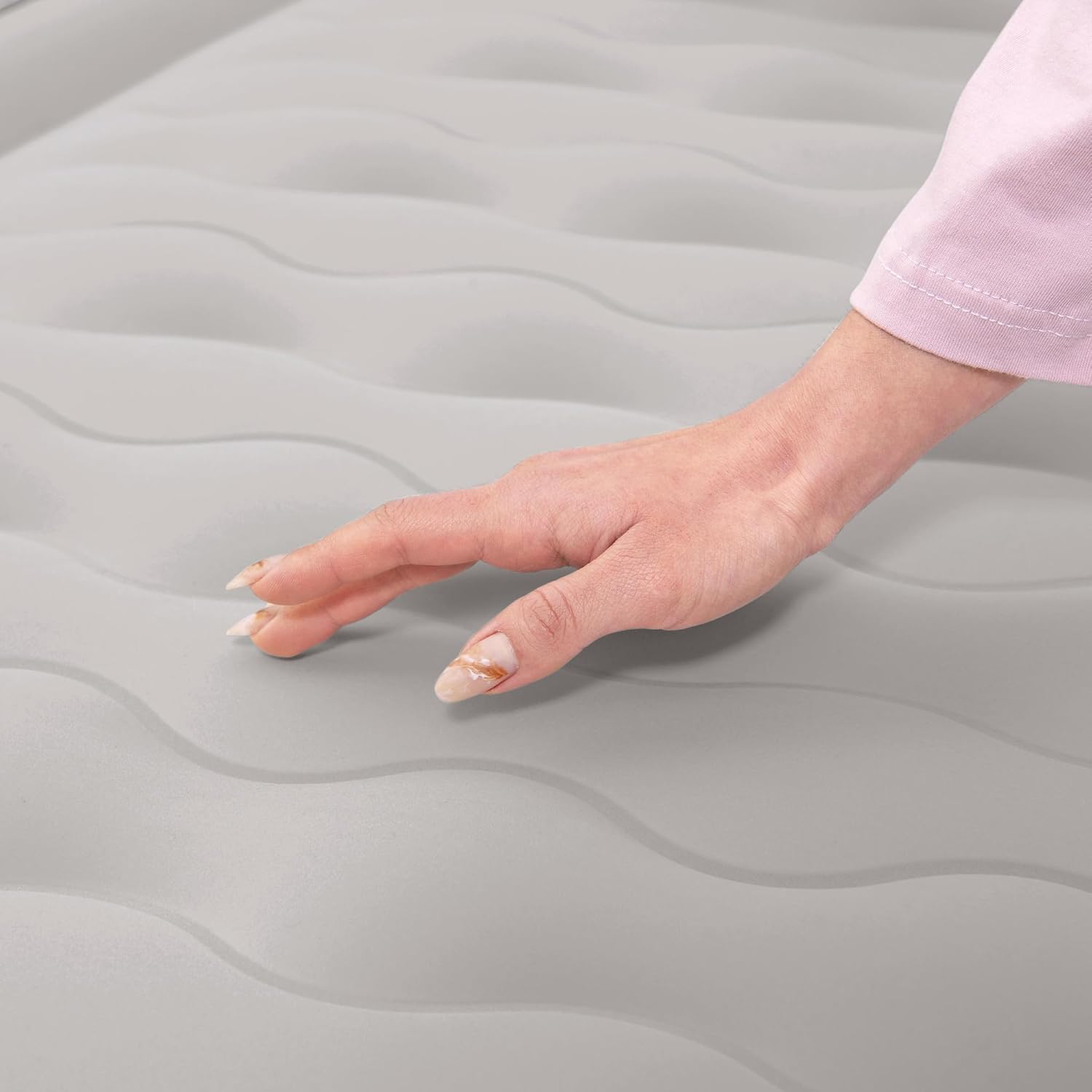 TOUGH GUARD: AIR MATTRESS - TWIN 18" BUILT-IN AC PUMP - Both durable and comfortable, the Bestway Tough Guard Air Mattress has a stretch-resistant surface that is also smooth and soft to the touch! This Twin bed is heavy-duty while still being lightweight, making it the premium choice. DURABLE CONSTRUCTION: Constructed for lasting durability, this air mattress is made out of Tough Guard material. This fusion of PVC and polyester is stronger than traditional PVC, while still being 10% lighter weight. This durable material is also 75% more puncture resistant, 92% more stretch resistant, and 150x more scratch resistant. Feel comfortable all night thanks to the specially designed, woven material that ensures the bed never feels too hot or too cold. Drift off in comfort on luxurious wave beams, which help to maintain spinal alignment and provide contoured pressure relief as you sleep. The surrounding frame design also prevents roll-off throughout the night. LUXURIOUS SURFACE: The Premium Soft Top sleeping surface is made up of 2 layers of velvet-like material. These layers trap air between them to provide cushion, comfort and support for a restful night's sleep. SIMPLE SETUP: The built-in AC air pump inflates the mattress in 3-4 minutes, so it is ready for bed when you are. In the morning, the quick deflate valve allows for easy takedown. Simply place your flattened and folded bed in the included carry bag for easy transport and storage. OVERVIEW: Twin air mattress - fits 1 adult. Designed for indoor use. Weight capacity: 397 lbs. Size: 75 in. x 38 in. x 18 in. Tough Guard exterior is 150x more abrasion resistant, 92% more stretch resistant and 75% more puncture resistant than PVC. Surrounding frame design prevents roll-off and increases stability. Built-in 110-120V A/C pump inflates the bed in 3-4 minutes.