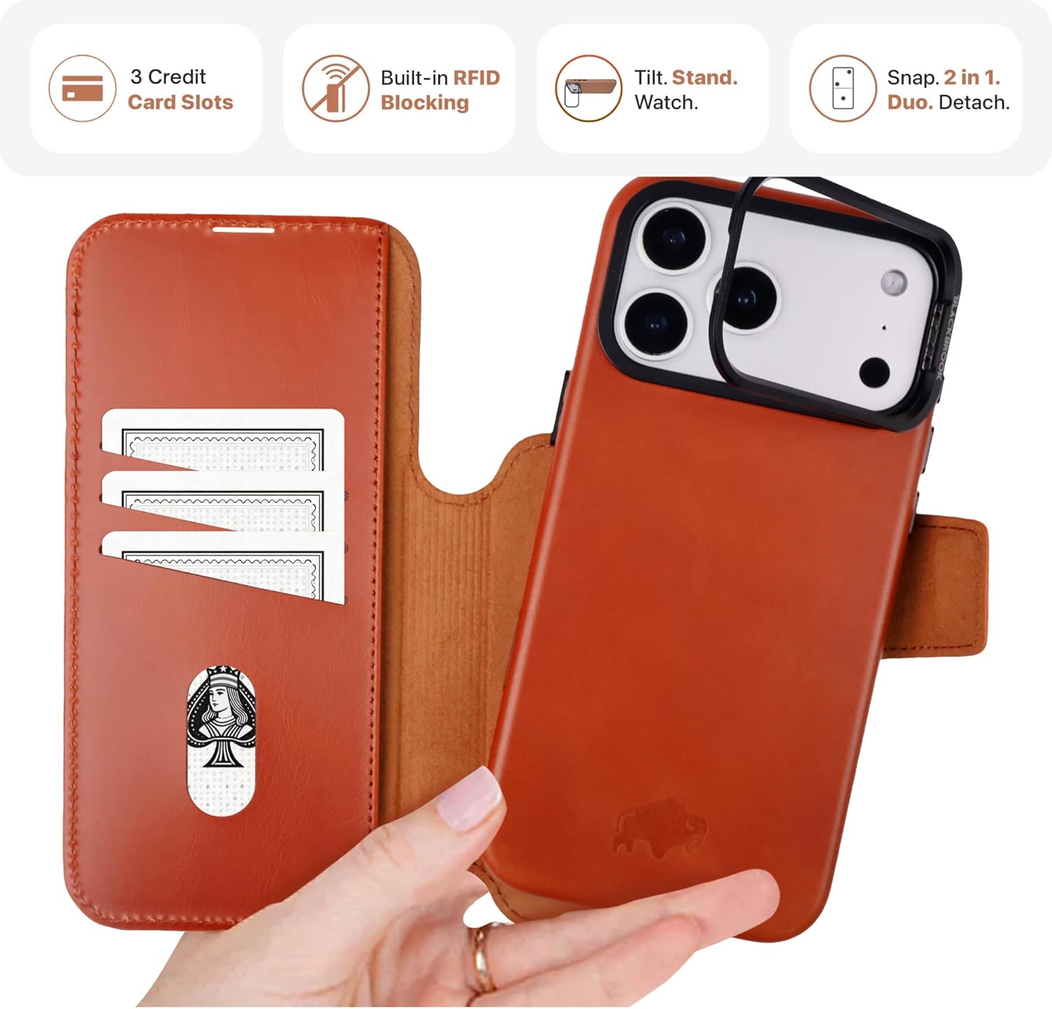 Burkley Compatible with iPhone 17 Pro Max Leather Wallet Case Blending timeless craftsmanship with modern functionality, this versatile wallet case is handcrafted from full grain leather and tailored for your device. It combines the elegance of a wallet with the protection of a phone case. 2-in-1 Detachable Design - Use as a slim leather case or attach it to the wallet folio for added storage and protection. Secure Magnetic Hold - Strong built-in magnets keep the case and wallet firmly connected, yet easy to detach. Card & ID Storage - Three card slots, each designed to hold one card securely. If you want a kickstand, use included Barlow with Stand snap-on. RFID Shielding - Helps protect your cards against electronic scanning and identity theft. Full Grain Leather Quality - Unlike PU or split leather cases, this case uses the most durable and natural cut of the hide, offering a rich texture and unique character. Protective Closure - Wide magnetic flap keeps your essentials safe inside. Tailored Fit - Precision cutouts provide seamless access to all ports, cameras, and buttons. BlackBrook Cases are handcrafted leather goods for your everyday life. Made by artisans, not machines. Each piece is created with care for a precise fit, reliable protection, and a refined everyday look.