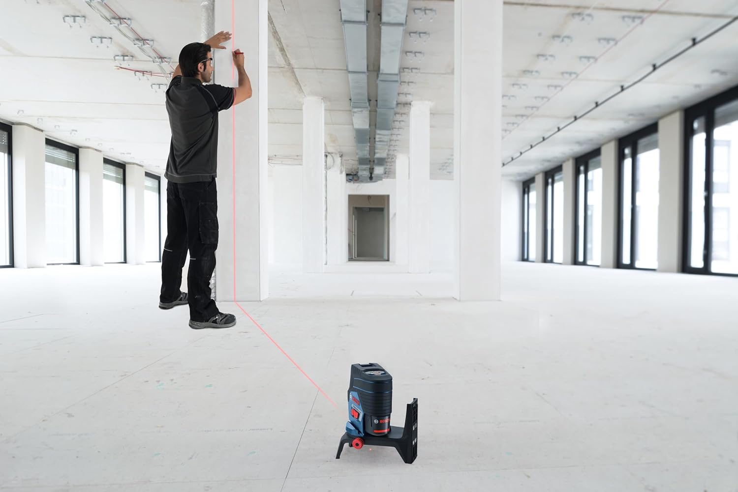 The Bosch GCL100-80C 12V Max Connected Cross-Line Laser with Plumb Points delivers all-in-one versatility, with highly visible lines and points. They provide horizontal level, vertical alignment and plumb point transfer applications. The tool features Bosch-exclusive VisiMax™ technology, which monitors tool temperature and power consumption to deliver the brightest line for the job. The laser features Bosch 12V Max Lithium-ion power for extended laser runtime during complex or all day layout jobs, provides a visible range of 100 feet and can work with an optional Bosch laser receiver (LR6 or LR8) to extend that range to 165 feet. The Smart Pendulum System self-levels up to +/- 4 degrees, indicates out-of-level condition and locks for safe tool transport. The manual mode locks lines for use at any angle. The laser comes with the RM 2 Magnetic Rotating Mount that rotates 360 degrees, has a micro-fine adjustment knob and includes a ceiling grid clip.