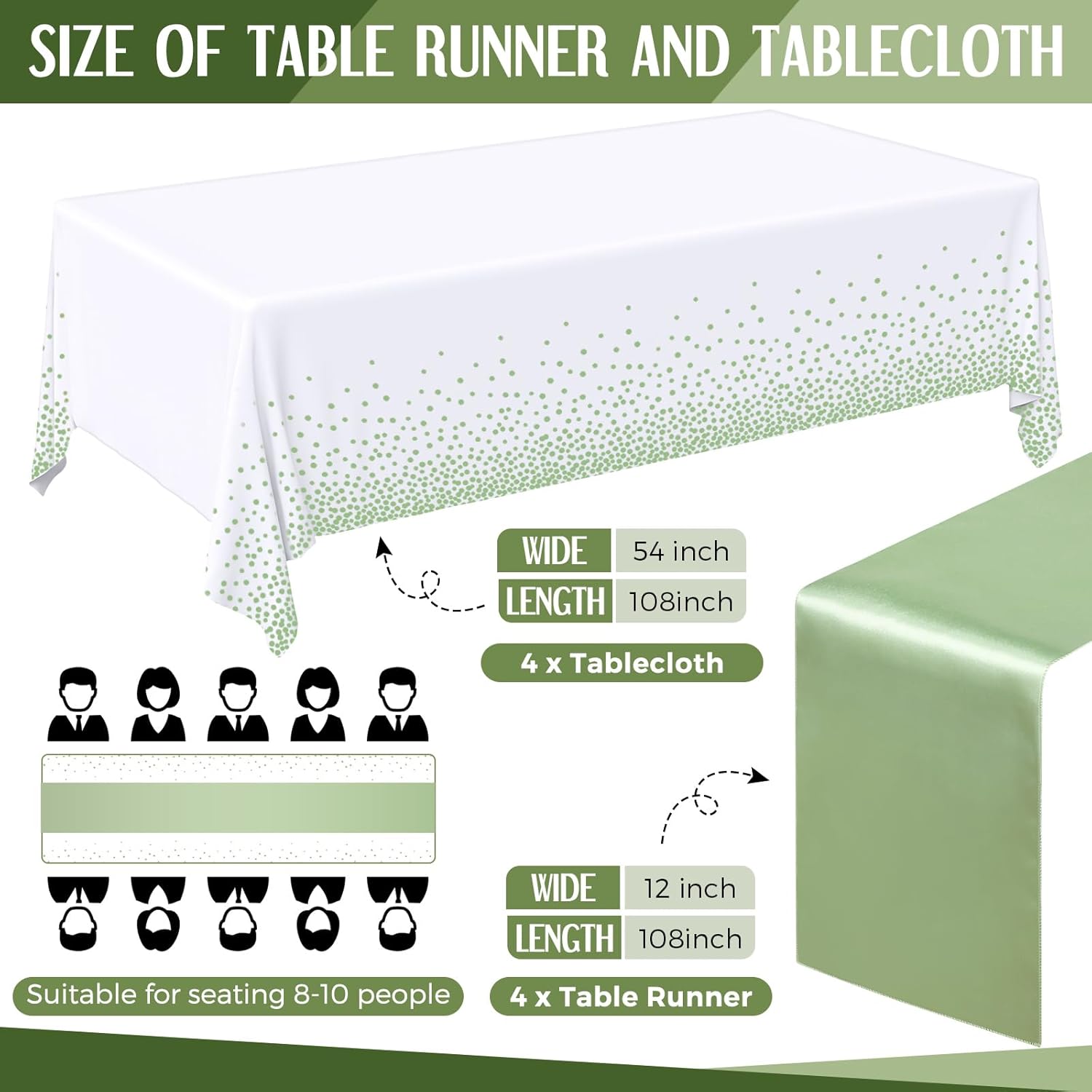 Breling 24 Pack White and Sage Green Disposable Plastic Tablecloths and Satin Table Runner Set, 54 x 108 Inch Tablecloth, 12 x 108 Inch Table Runners for Wedding Graduation Birthday Baby Shower