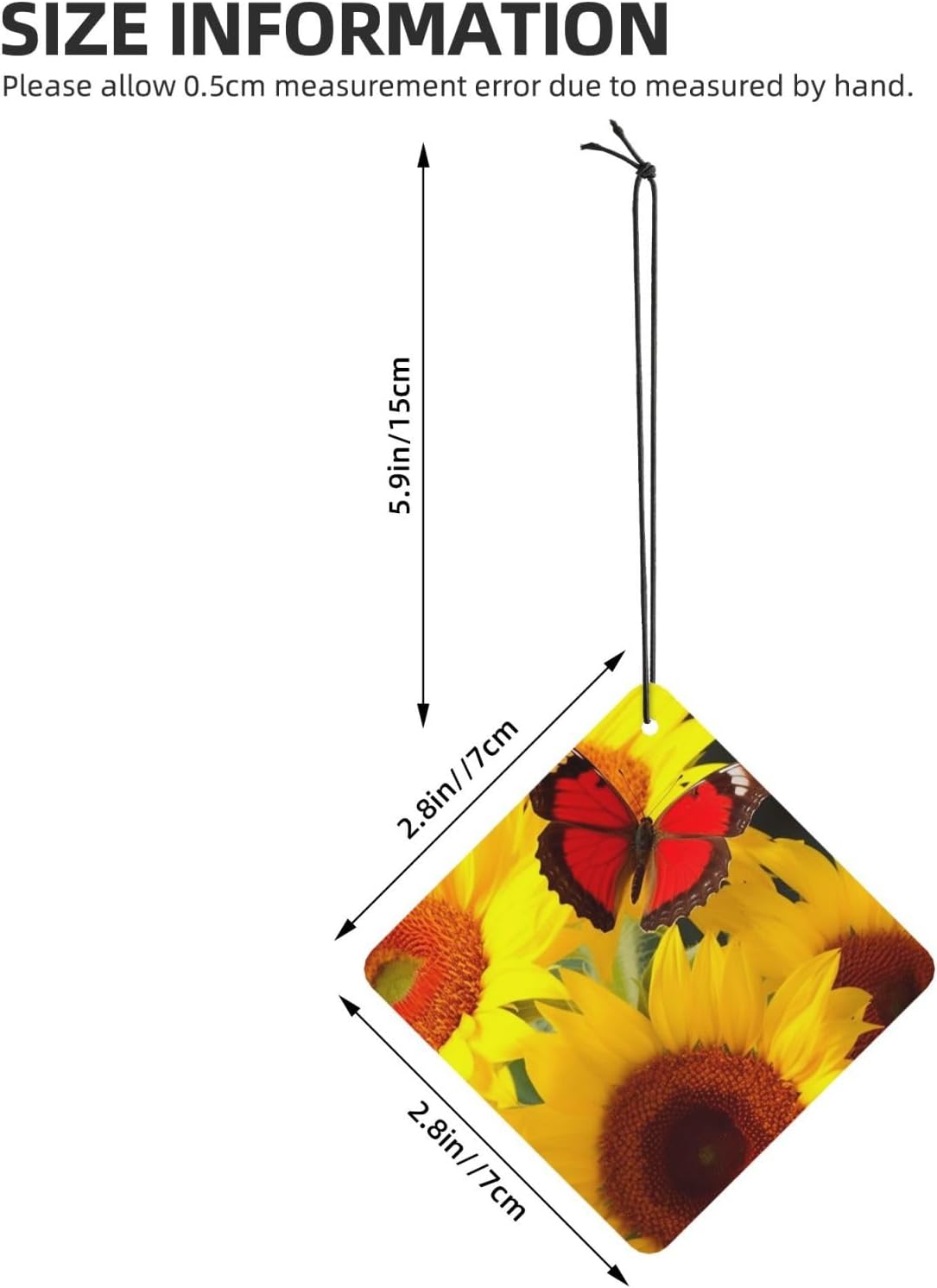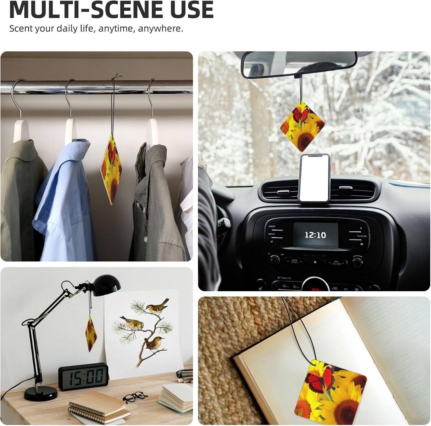 unobstructed vision: this Yellow Sunflowers with Red Butterfly rearview mirror scented fresheners doesn't obstruct your vision while driving, ensuring a safe and comfortable journey every time.easy hang: we've included a convenient rope for hanging, making it super easy to attach this christmas air freshener wherever you prefer. No fuss, no mess - just hang and enjoy the fragrance.incredible package deal: this rearview mirror pendant aromatherapy tablets package includes 6 pieces in 6 captivating designs and 1 refreshing scents (lavender). Experience a variety of delightful fragrances that will keep your surroundings smelling wonderful throughout the day.environmental protection: the car air fresheners for women smell can last for about 1-2 weeks. When the smell fades, you can add your favorite perfume. Continue to use, reusable6 pcs included: you will receive 5 individual shoe cabinet fresheners, each in its own package; enjoy consistent scents for nearly a year, or share them with your friends or families