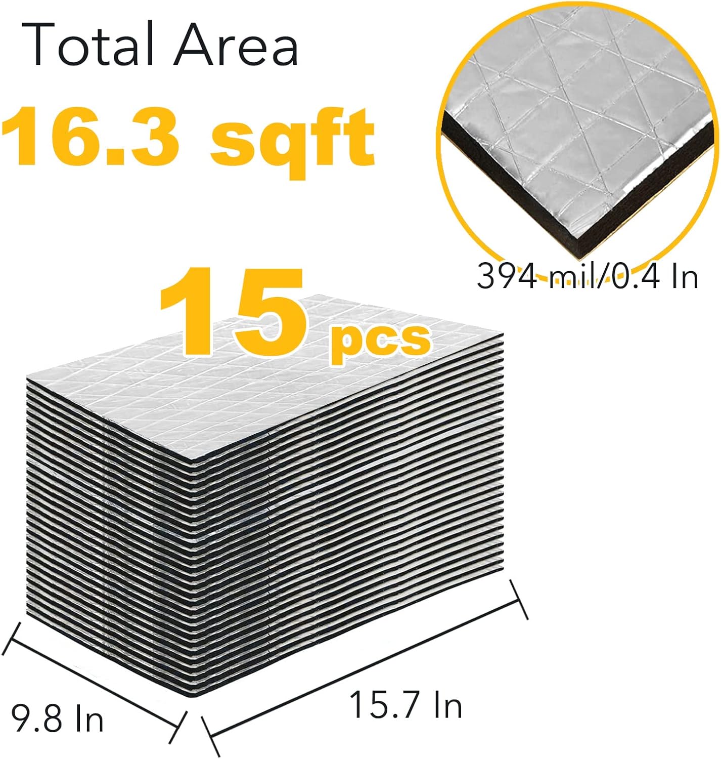 • Insonorizzante mats (closed cell PE foam) with waterproof glue. Thickness 197 mil / 5mm. Pack of 8(single piece 1.09 sqft). Total coverage area - 8.72 ft², working Temperature Range: -40°F ~ 300°F