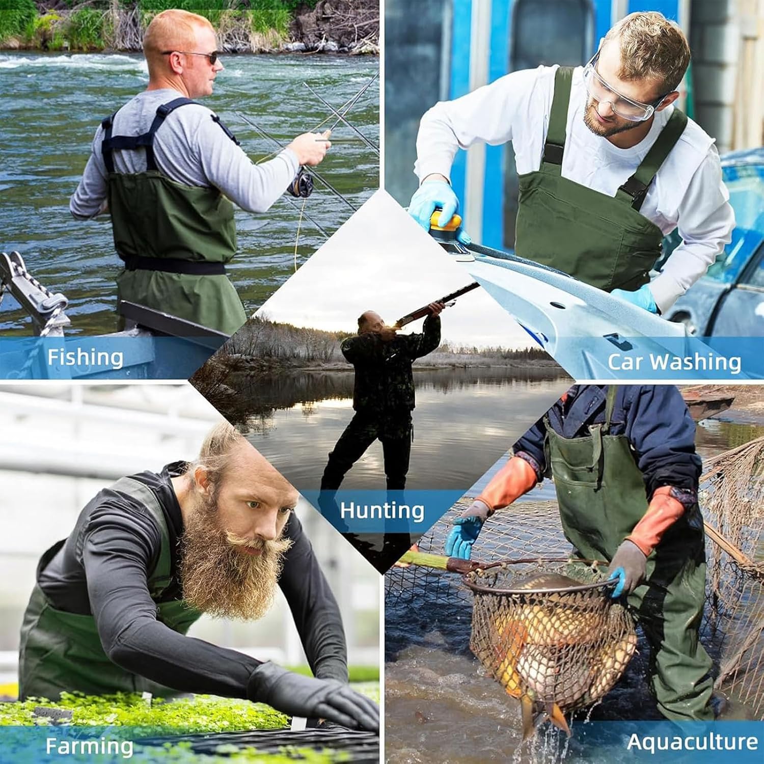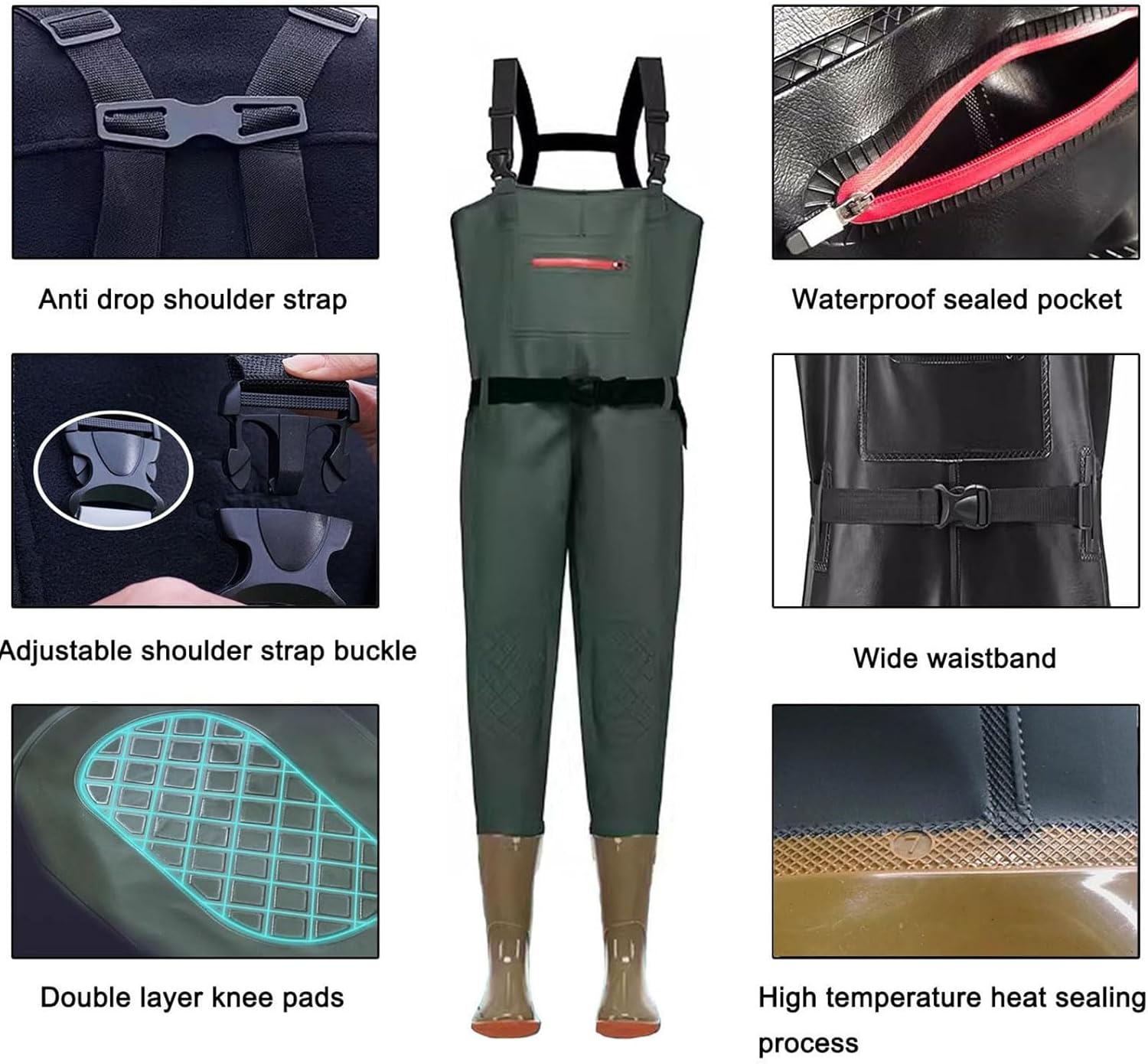 Unleash Your Outdoor Adventure The chest waders is the ultimate outdoor footwear choice, trusted by hunters, trappers, fishermen, and a diverse range of outdoor enthusiasts Description: -Chest waders are made of lightweight and comfortable PVC material, which is waterproof and long term use -Adjustable shoulder straps for greater flexibility and more comfortable squatting -Elastic waistband at the waist for free adjustment -Large capacity waterproof sealed pocket, splash proof, and anti phone detachment -Wearing rubber soles, anti slip and puncture resistant Specification: Product Name: Waders, Waders, Fishing pants, Fishing wear, Hunting boots Material: PVC Color: Green , Black , Gray , Khaki Applicable gender: Men Sizes: 38, 39, 40, 41, 42, 43, 44, 45 Package Contains: 1 x chest waders Attention: If you have Bigger Thigh Circumference, please Choose ONE SIZE LARGER than usual. (Please refer size chart).