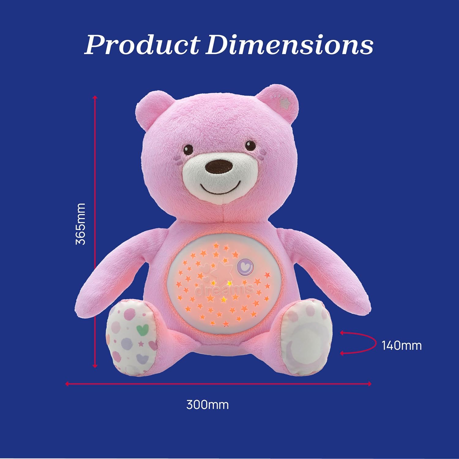 Chicco First Dreams Baby Bear is a soft projector with spectacular light effects and soothing melodies: 100% soft and cuddly, with soft plastic parts. Projection with automatic light colour change. Equipped with 3 light effects for different levels of relaxation: night projection with magical atmosphere. Soft projection to promote baby's relaxation. Anti dark light to reassure your baby. In addition, the plush offers 30 minutes of classic melodies (with music by Bach and Beethoven), jazz, soft rock, modern, new age and nature sounds, with a button to select your favorite melody. Machine washable. Product dimensions: 30 x 14 x 36 cm. Requires 3 x AAA batteries (not included).