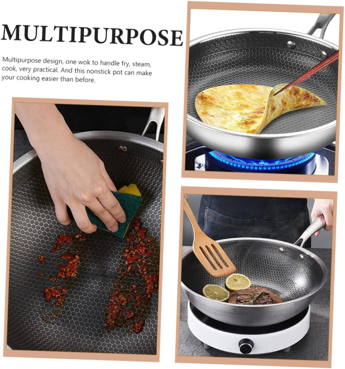 Package List 1 x Wok Characteristics -Size: 53.00X31.00X8.50cm/20.83X12.18X3.34in kitchen wok -Color:Grey frying pan -Material:Stainless Steel wok pan - The excellent workmanship of our product will bring you a satisfying using experience and bring you happier mood wok stir-fry pan. - Nonstick frying pan design, reduce oil and smoke, even heating your food. Can be used for gas stove, electric ceramic furnace, electric furnace kitchen cookware. - Ergonomic design, high strength, high hardness, and excellent durability, it will easily meet your needs portable fry pan. - You can use it to fry vegetable, seafood, cook soup or noodle, steam meat, and etc heavy duty wok pan. - stainless steel, anti-scratch, wear-resistant, you can clean it with dish easily wok for stoves.Goods Informationheavy duty wok pan It is made of solid materials.frying pan It without being easily damaged.wok pan It is an excellent frying wok pan that can bring you more convenience, allowing you to have a more comfortable experience.chinese wok This product is a frying wok pan.chinese wok pan It is and