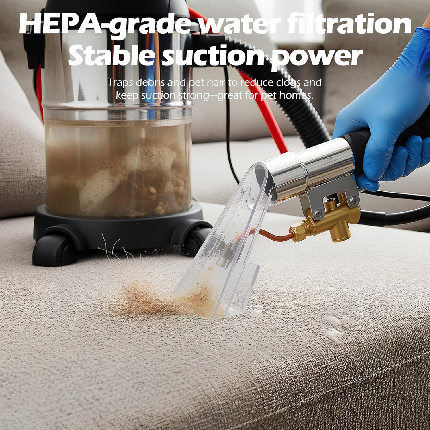 SPECIFICATIONInlet Compatibility:Shop vacuums with a tapered end 2.6-2.64in; 25in interface household vacuumsHose Length: 10 ft (3 m)Hose ID: 1-¼ in IDSolution Line Length: /25 ft (7.6 m) burst-resistantPressure Rating: max 300 psi (20.7 bar)Extraction Wand Material: Clear polycarbonate (PC)Adapters Supplied: 2 pcs: 1-¼ in female ↔ 2-½ in male taper fitWorking Temperature Range: 32 °F – 140 °F (0 °C – 60 °C)Boxed Weight / Dimensions: ≈ 4.2 lb (1.9 kg) | 17 × 12 × 4 in (43 × 30 × 10 cm)ALL-IN-ONE KIT 1* Extraction wand1* 10 ft flexible hose 1* 25 ft water pipe2* vacuum adapters1* HEPA water filter 8* Velcro straps Transform your everyday wet/dry vac into a pro-grade carpet & upholstery extractor in 60 seconds. This 10-ft crush-proof hose, 25-ft 300-psi burst-proof solution line and crystal-clear PC wand deliver 98 % dirt-lifting power, wiping out coffee, grease and pet stains before your eyes. HEPA wet filter keeps suction maxed; brass trigger and steel couplers guarantee zero leaks. Snap-fit 1.25" & 2.5" adapters lock onto Shop-Vac, Ridgid, Craftsman, Stanley and more—no tools, no mods. Detach the wand and you’re back to regular vacuuming instantly. Carpets, car seats, stairs, rugs—one lightweight kit, showroom-new results.